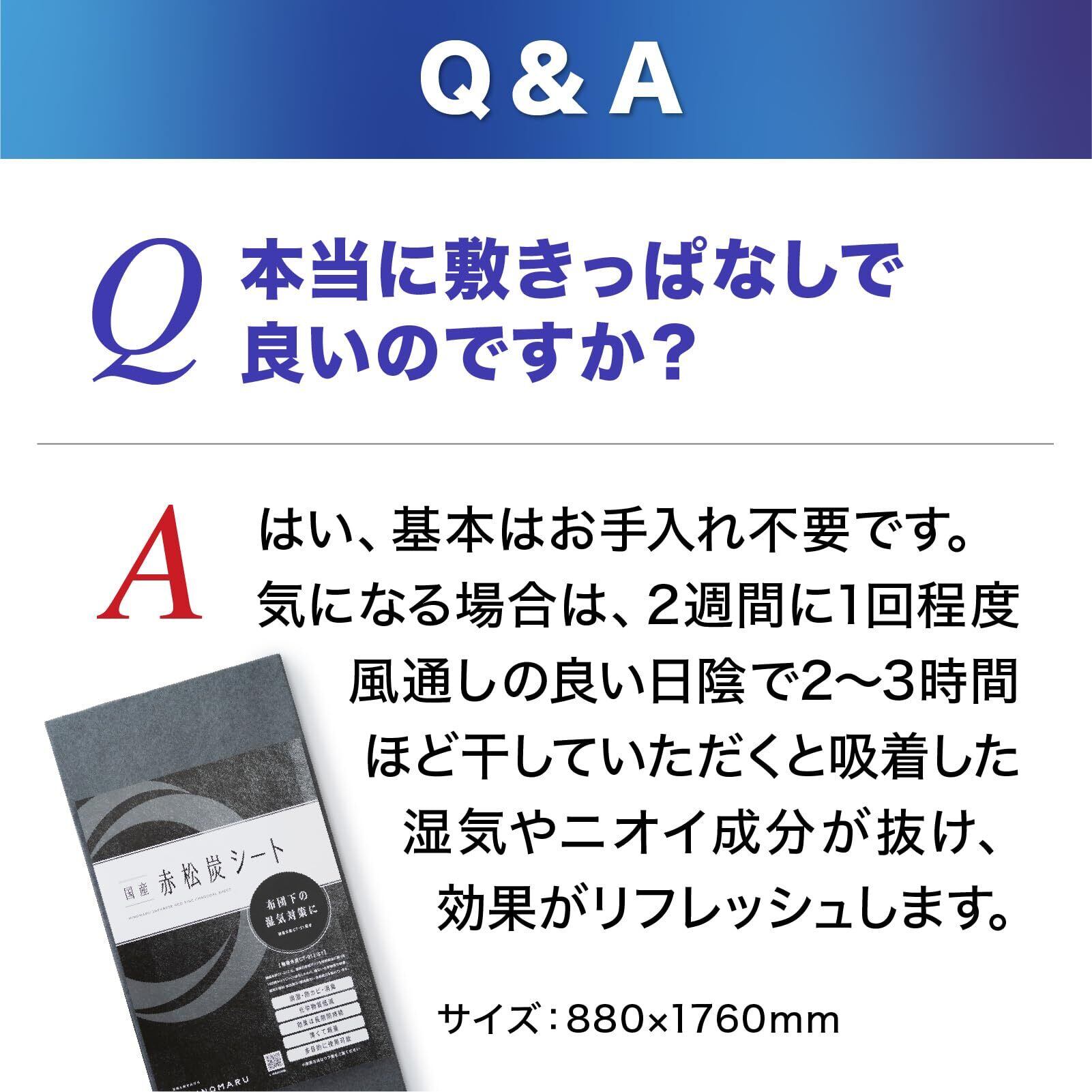 【より効果的なお手入れ方法】 基本はお手入れ不要ですが、2週間に1回程度、風通しの良い日陰で2〜3時間ほど干していただくと吸着した湿気やニオイ成分が抜け、効果がリフレッシュします。