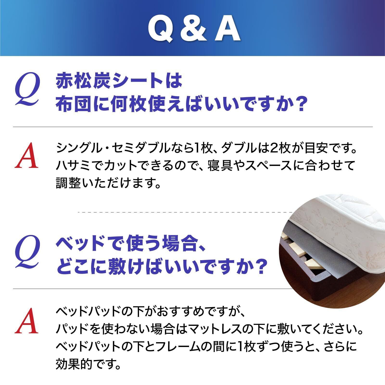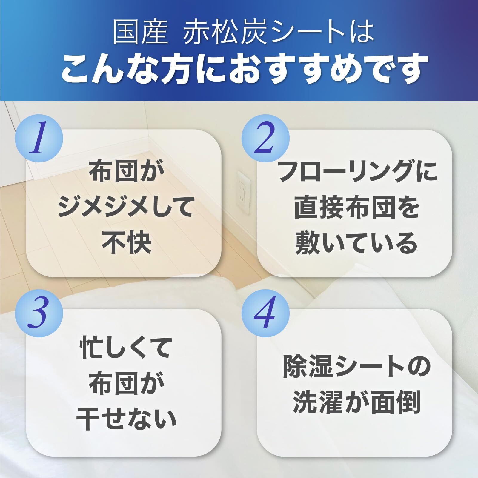 【湿度を整えてカビ繁殖をシャットアウト】 湿気がこもりやすい布団の下でも、赤松炭の調湿機能がカビの発生条件(湿度70%以上)を抑えます。カビ臭の原因から対策できるのが特長です。