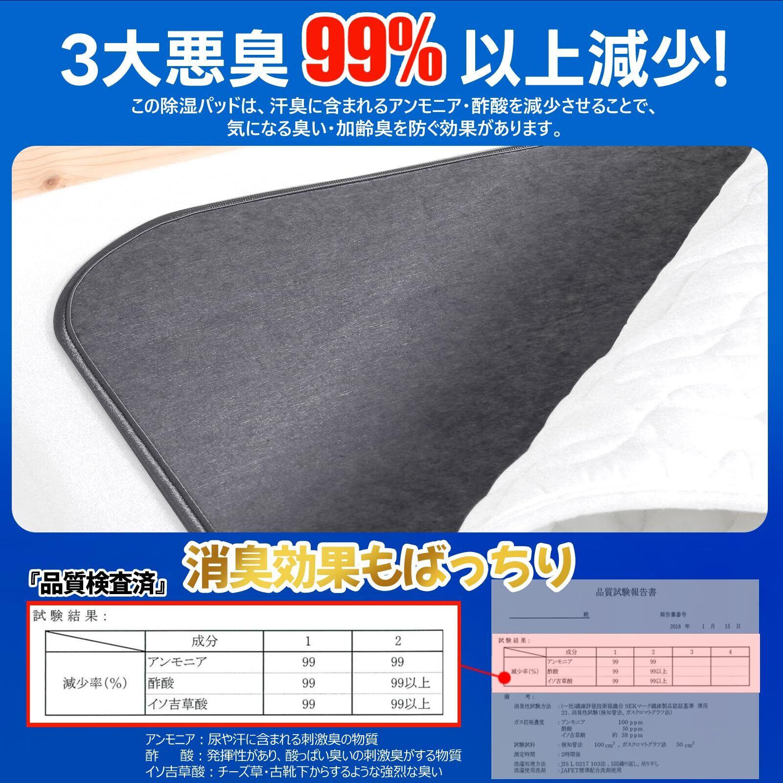 3大悪臭99 %以上減少:国内公的検査機関の消臭性試験にて実証されています。この除湿パッドは、汗臭に含まれるアンモニア・酢酸を減少させることで、気になる臭い・加齢臭を防ぐ効果があります