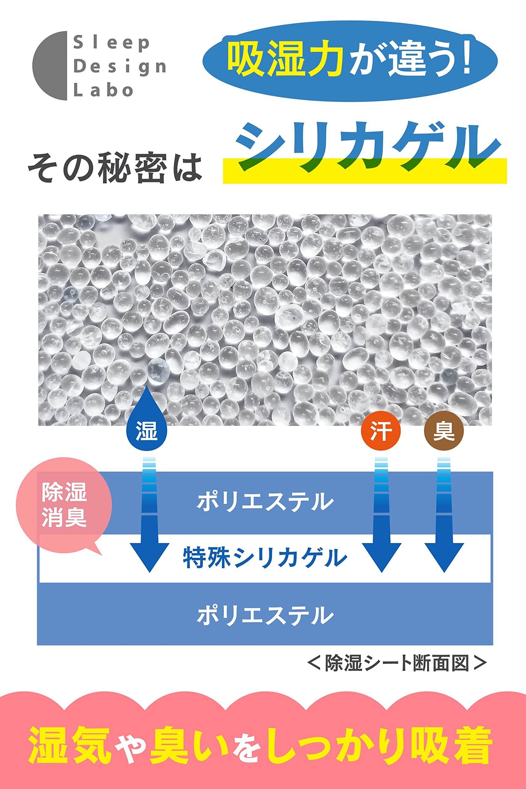 【シリカゲル配合】除湿シートにはシリカゲルを使用。シリカゲルは気になる汗、ニオイもすべて95%以上消臭してくれるので、夏場でも気持ちよくお休みいただけます。さらにダニの温床にもなりがちな敷き布団にも嬉しい、ダニを寄せつけず追い出す防ダニの力もある防カビシートです。基準の忌避率50%を遥かにしのぐ90% 以上を実現。さらにさらに、不快なニオイの原因となる菌も寄せ付けません。清潔面が気になる皆様の大切な寝具環境をトータルケアしてくれます!