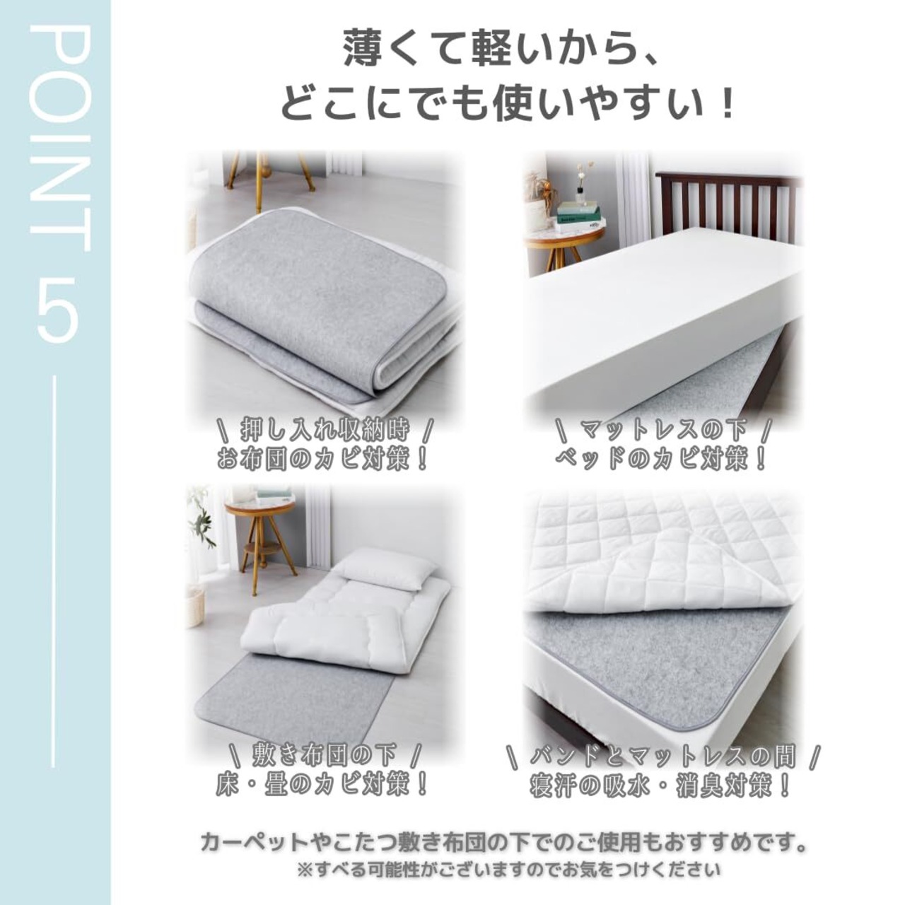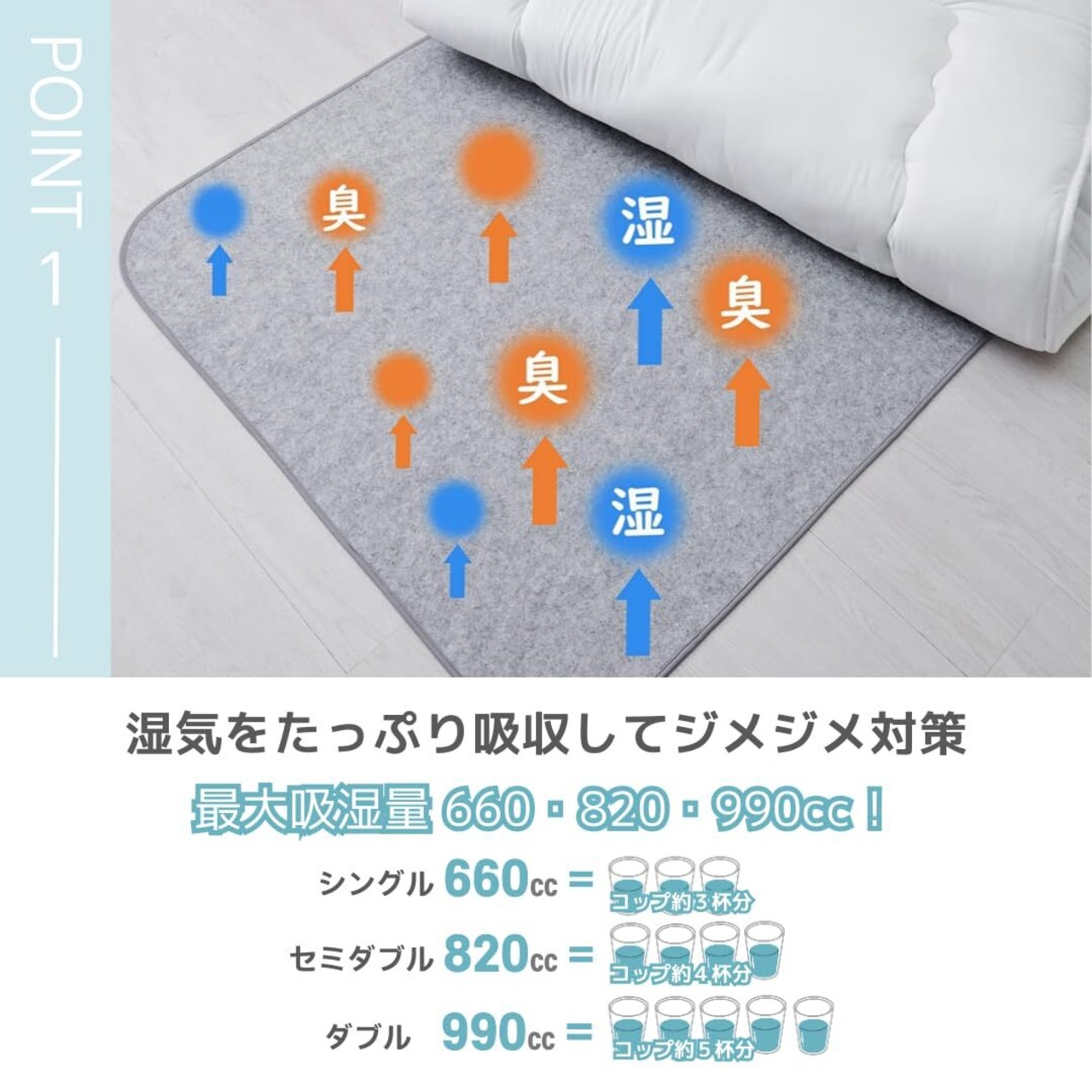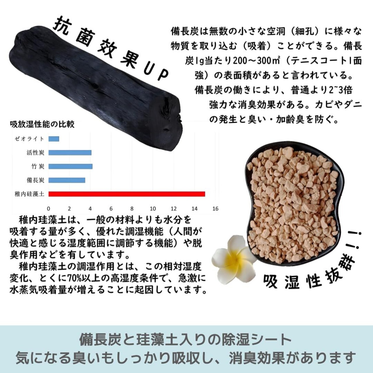 「吸湿性抜群・消臭抗菌」:備長炭、シリカゲルB型で作られた吸湿力抜群の除湿シートで快適に眠ることができます。湿気の多い梅雨、寝汗のかきやすい夏、結露が出やすい冬の、年間通した湿気対策が可能です。また、防ダニ・カビ加工付き。お肌の弱い方でもお使いいただけます。