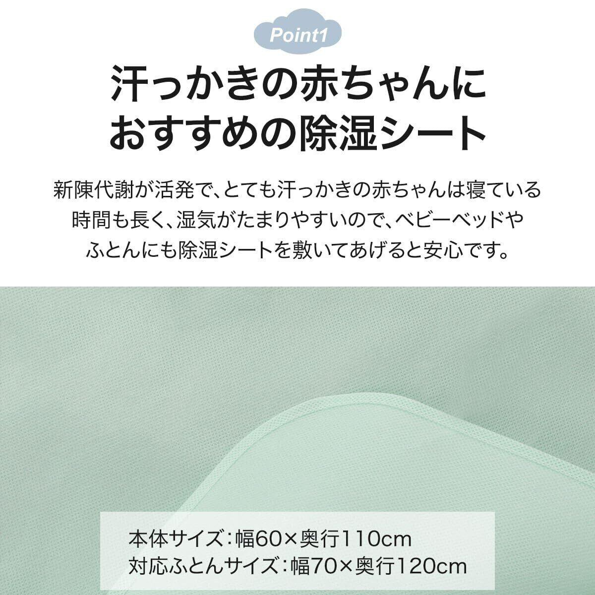 新陳代謝が活発で、とても汗っかきの赤ちゃんは寝ている時間も長く、湿気がたまりやすいので、ベビーベッドやふとんにも除湿シートを敷いてあげると安心です。