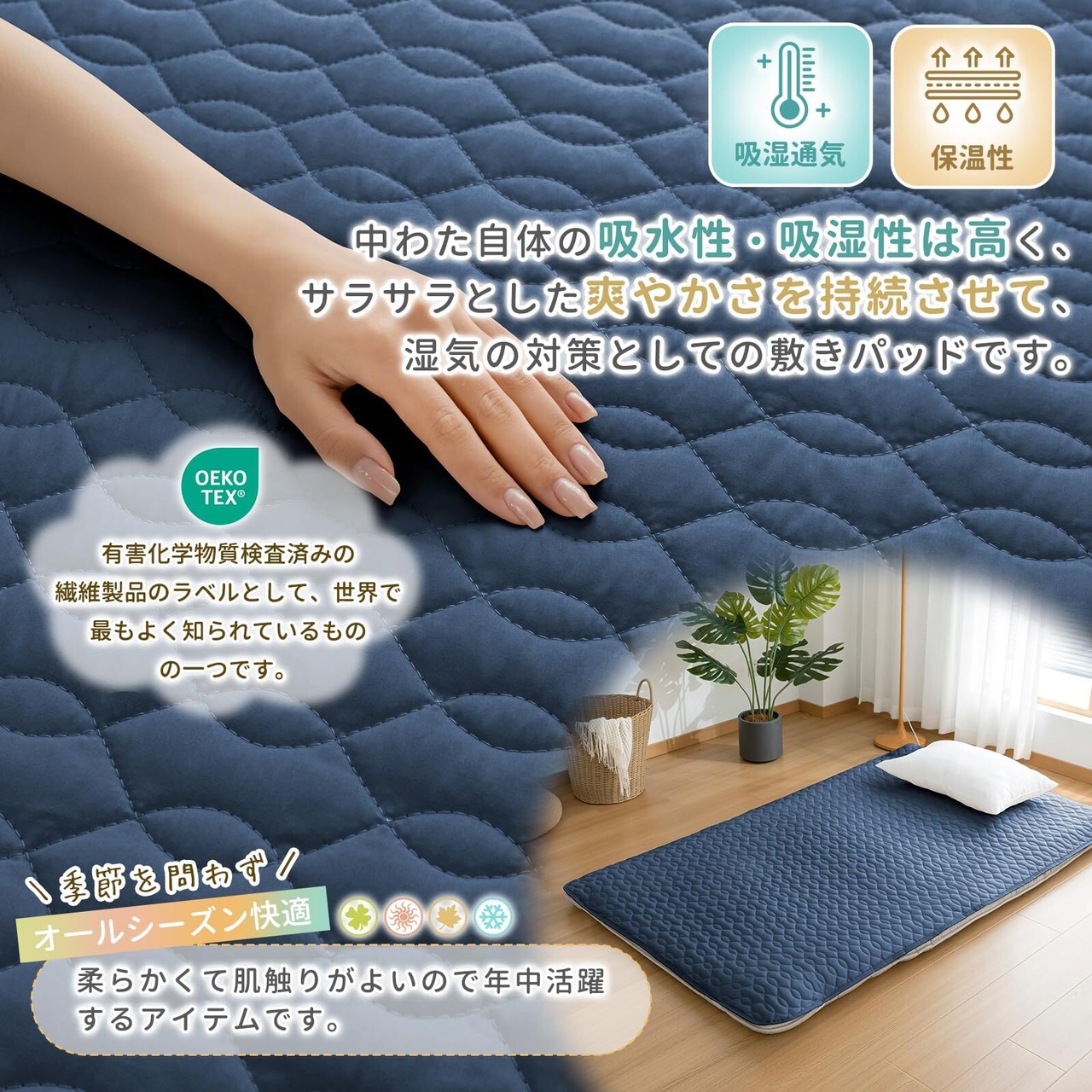 【お肌にやさしい心地】肌に優しい表地は通気性がよく、汗をかいても水分が素早く吸収し、すぐに乾きます。汗をかきやすい夏も快適な使い心地。吸水性と通気性に優れた素材のため、敷きパッドは汗などの水分をたっぷり吸収し、速乾してさらっと快適にお使いいただけます。蒸し暑い夏や、季節の変わり目に活躍します。