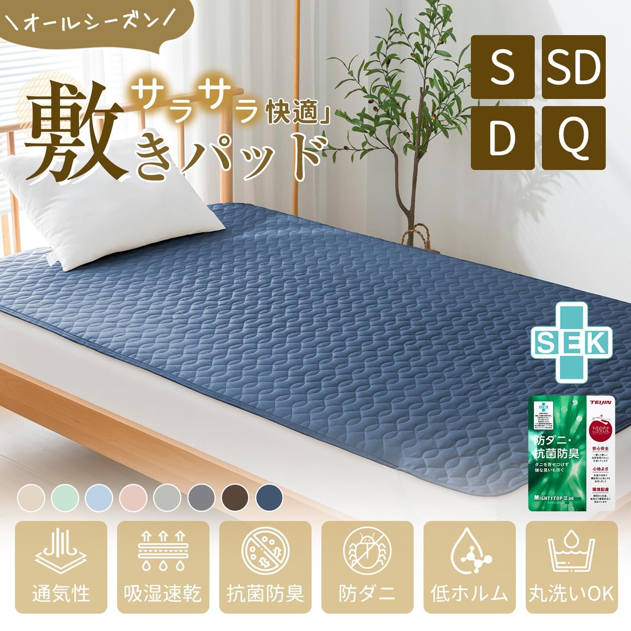 【TEIJIN抗菌防臭・防ダニ中綿使用】TEIJIN(帝人)マイティトップⅡ中綿を使用し、SEK認証された優れた抗菌防臭効果で、細菌の繁殖を防ぐ抗菌・いやなに臭いを抑えます。通常の繊維と比べて、洗濯耐久性を実現しています。オールシーズンずっと心地よくお休みいただける品質にもこだわりました。