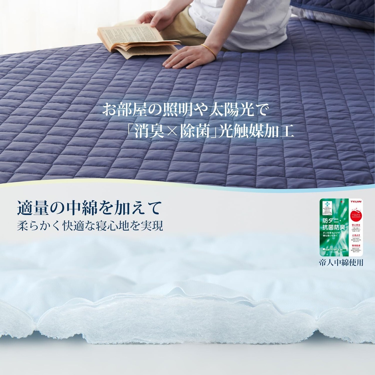 【3層構造でさらふわ】「ひんやり繊維」+「速乾中綿」+「通気ワッフル」の3層構造で肌触りがより柔らかくなります。さらに、寝汗や皮脂をしっかり吸収し、マットレスへの浸透を防ぎ清潔さを保ちます。