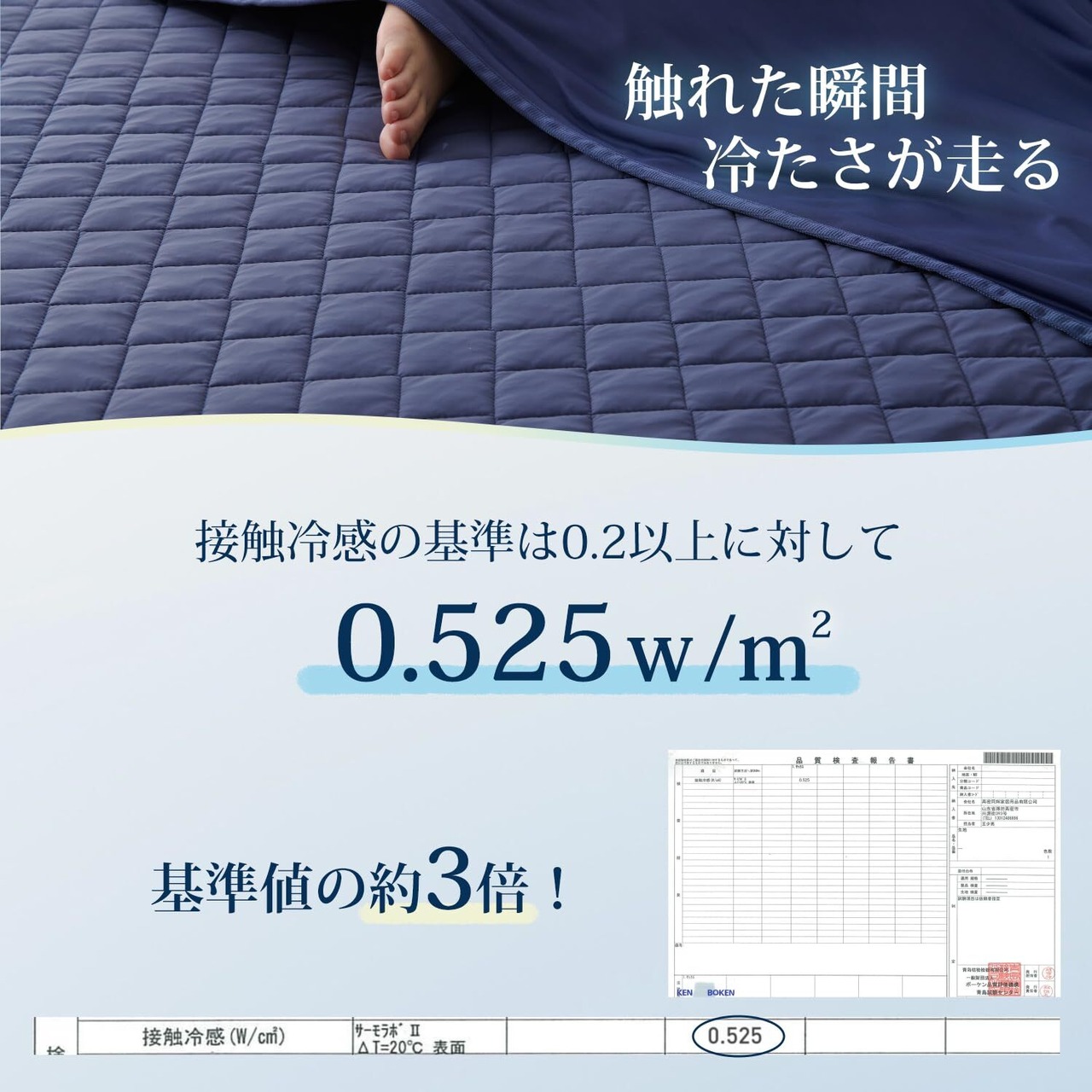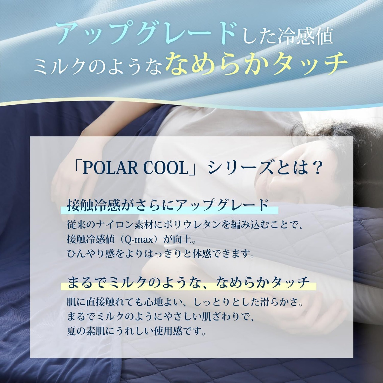 【ひんやり・なめらかな触り心地】ナイロンとポリウレタンの高機能素材を使用。しっとりとした肌ざわりで、まるでシルクのようななめらかさ。Q-max値は0.525という高数値を記録した快適な冷たさで、寝返りを打つたびに「ひんやり感」が味わえます。クーラーと併用して使うとより効果を感じることができます。