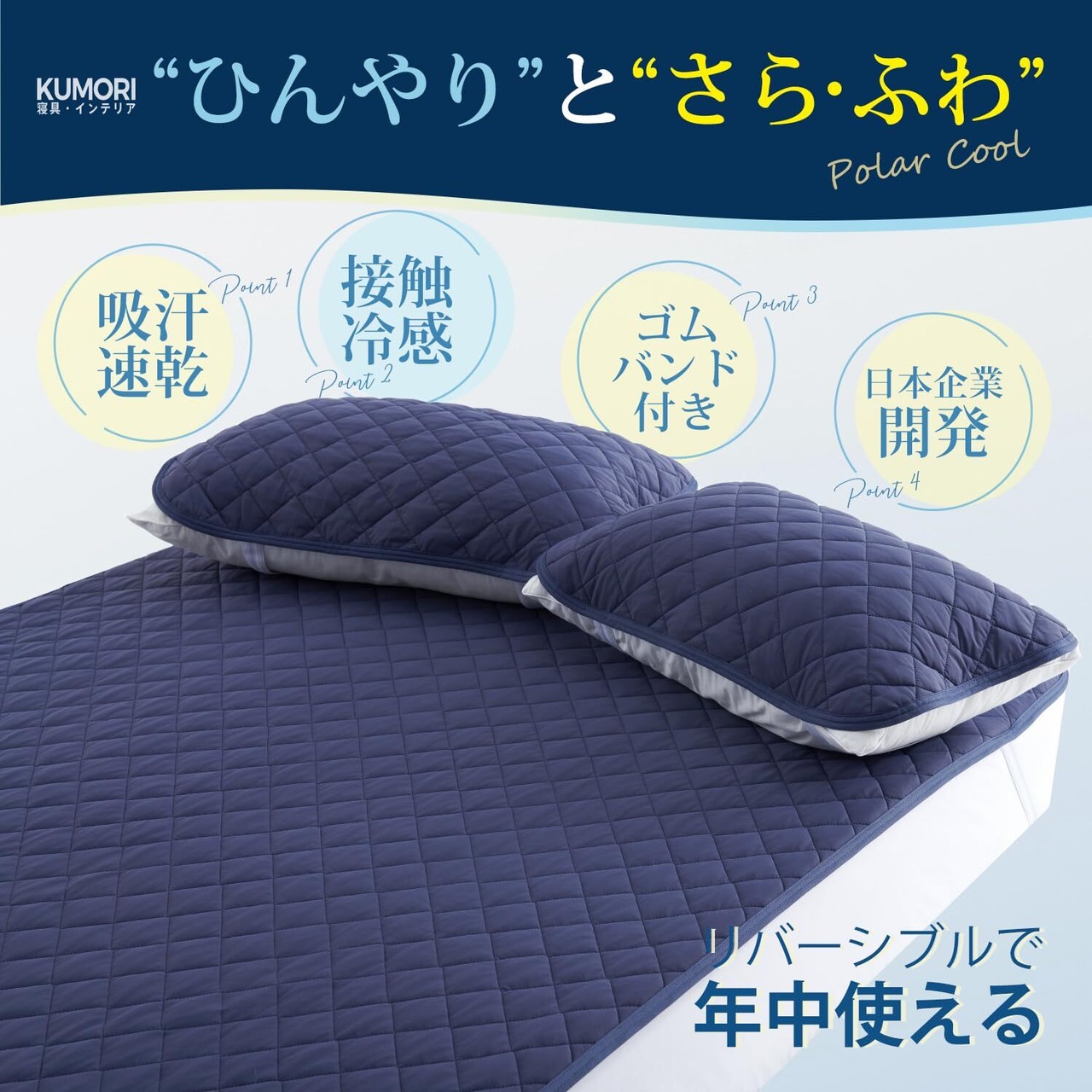 【在庫限り】クモリ(Kumori) 敷きパッド 極冷感 シングル 夏用 リバーシブル 「POLAR COOL」 接触冷感 ひんやり 冷感 オールシーズン 吸湿速乾 さらふわ 蒸れにくい 通気性がいい 軽量で洗濯しやすい クールパッド ベッドパッド 100X200cm ネイビー