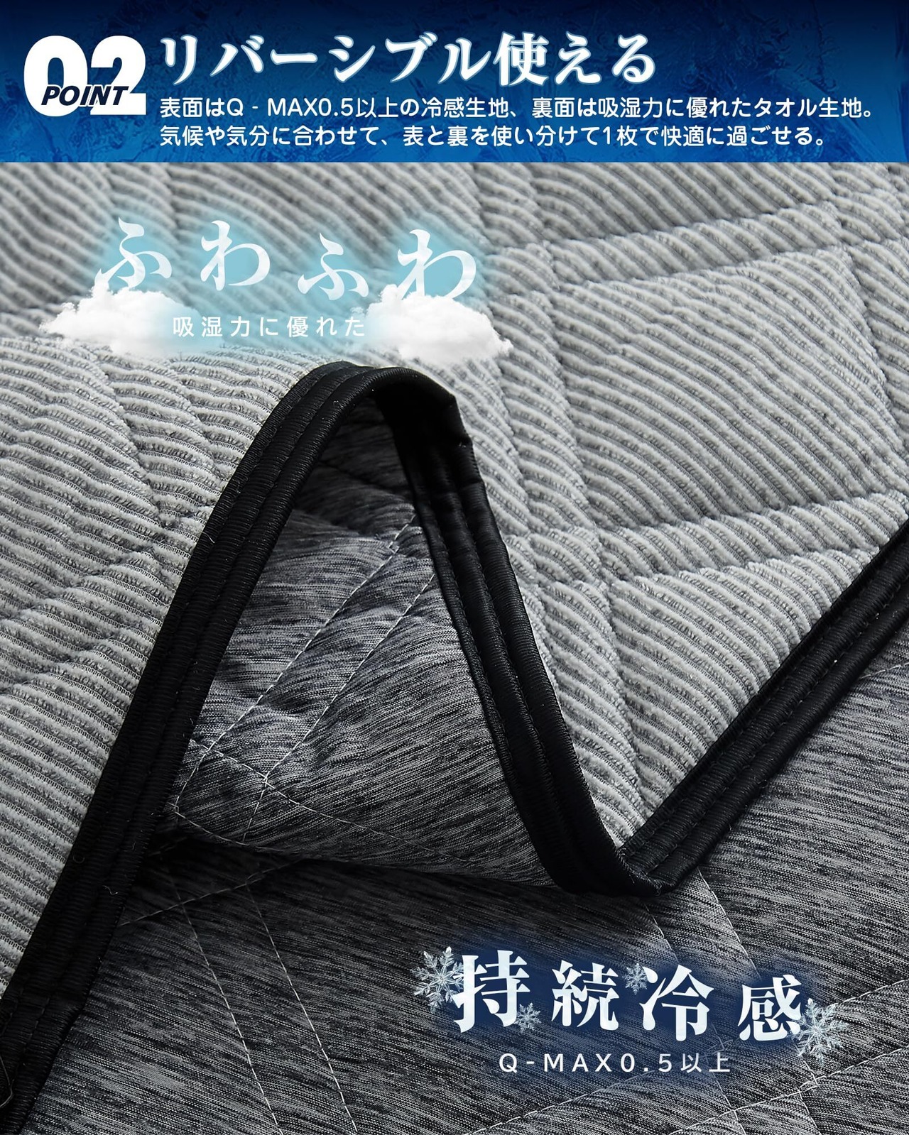 【リバーシブル】表面は業界最高レベルの冷たさQ-MAX0.5以上の接触冷感生地で、触れた瞬間ヒンヤリ!裏面はやさしい肌さわりタオル地。気候や気分に合わせて、表と裏を使い分けて1枚で快適に過ごせる!ポリエチレンの白糸と、カラーに染めたナイロンの2色の糸を混ぜ織りにすることで、涼しげな霜降りデザインに仕上げました。