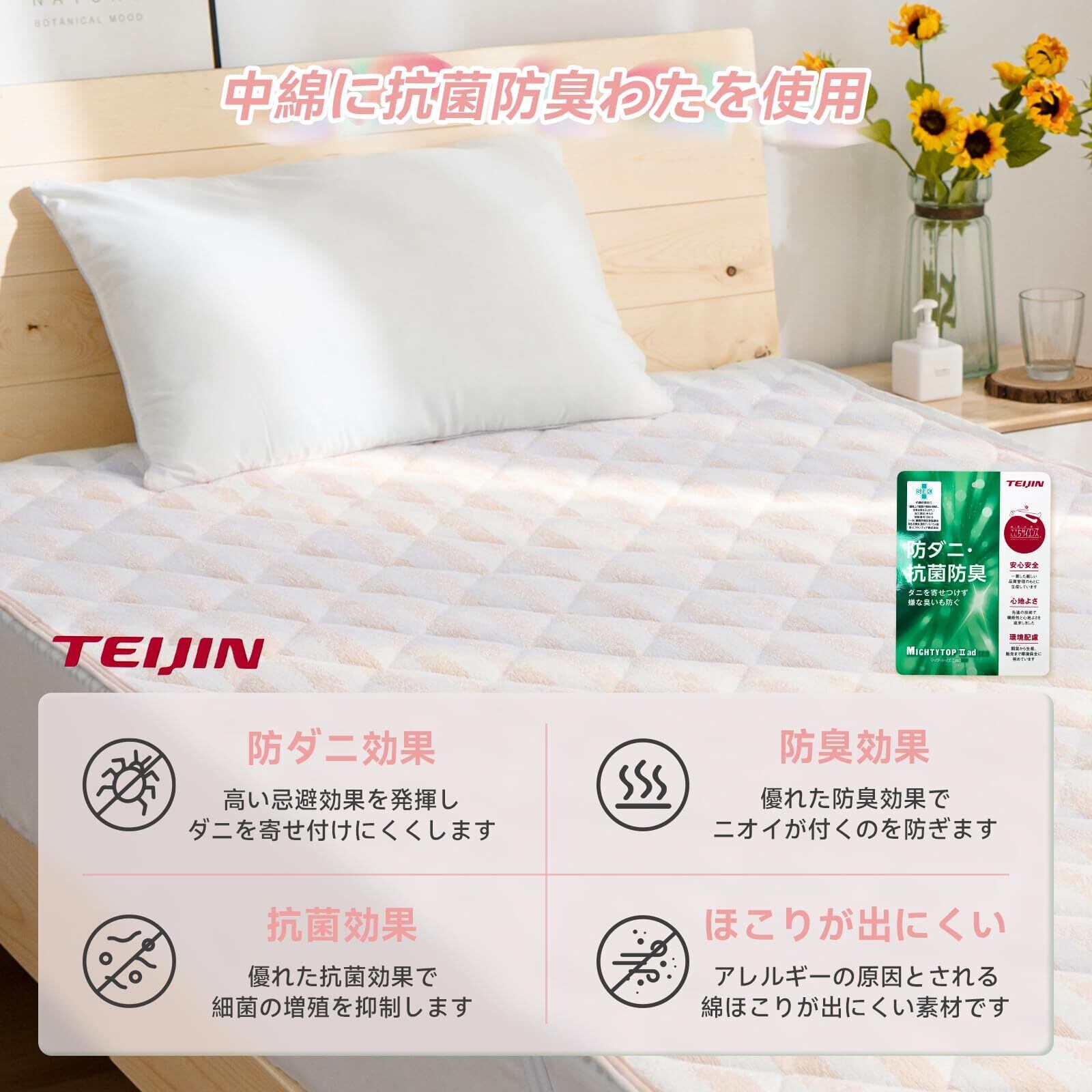 【抗菌防臭・「TEIJIN」の中綿】中わたにテイジンの機能繊維「マイティトップII ECO」を使用する。側生地にはダニを通しにくい加工を施しているので敏感なアレルギー体質の方や小さなお子様にも安心。SEK認証された優れた抗菌防臭効果で、湿気や寝汗などによる菌の増殖を抑えてそれによって引き起こされる嫌なニオイの発生も防ぎます。