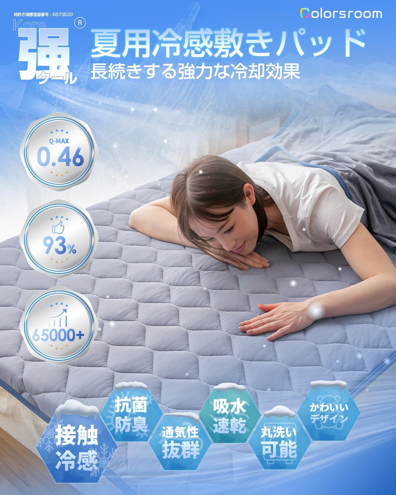 【ひんやりした肌触り】Q-MAX0.42熱伝導性の高い素材を使用することで、触った瞬間ひんやりとした心地よさがあります。冷房や扇風機などを併用すると、さらにひんやりと気持ちよくお使いいただけます。