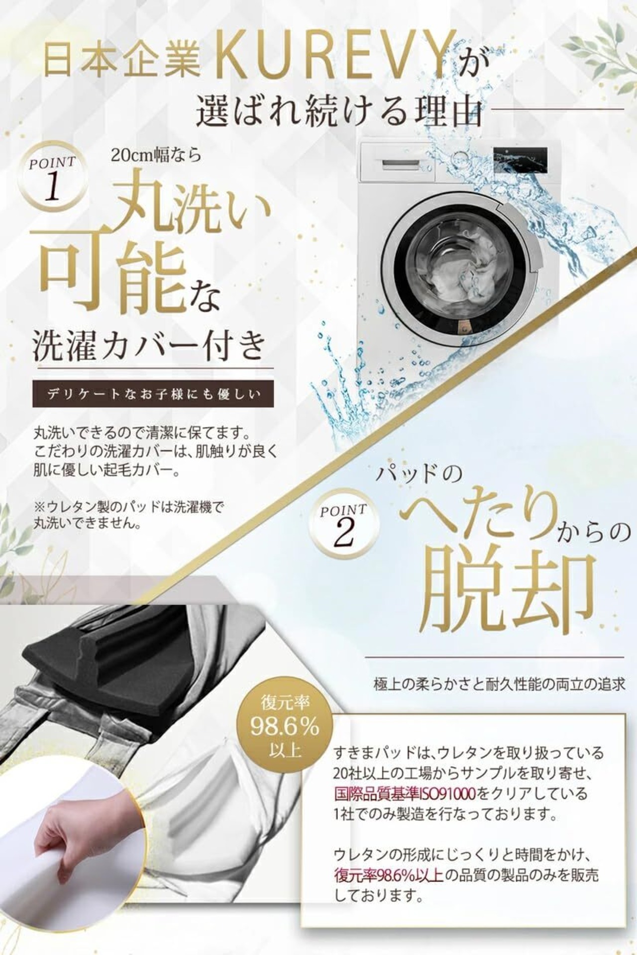 【日本メーカー「kurevy」が選ばれ続ける理由】 同じような型の"隙間パッド"でも使っているとすぐに”ヘタる”ような製品もありました。これは工場によると、生産スピードを優先してスポンジの形成に時間をかけていない製品に起こりがちとのことでした。kurevyの隙間パッドはウレタンの形成にじっくりと時間をかけ、復元率98.6%を超える品質の製品のみを販売しております。パッド幅を広げた模倣品が多く出回ってますが、”ウレタンへのこだわり”が違うことを是非ご体感ください。