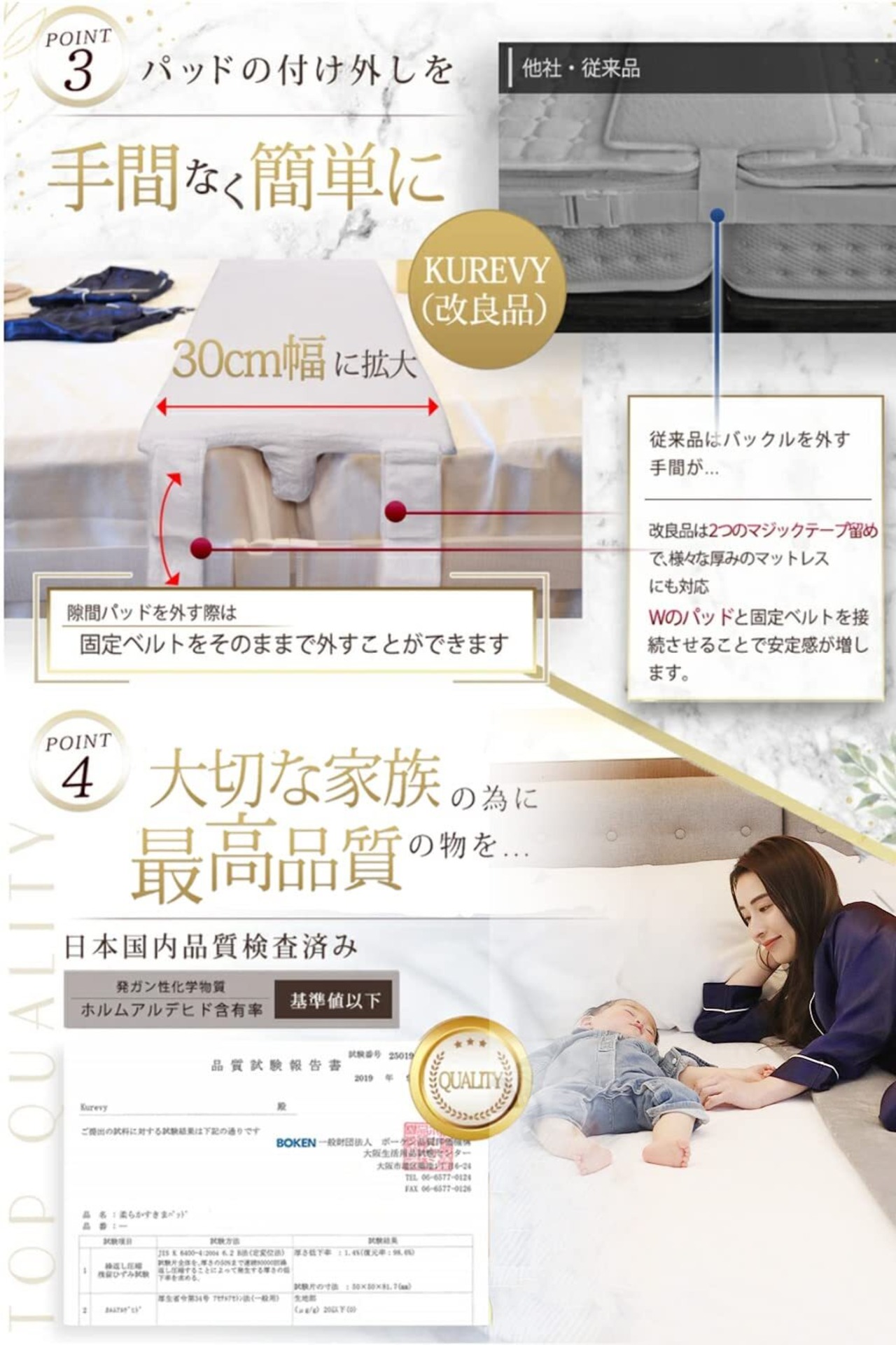 【最新改良版 隙間パッド】すきまパッド幅を13cmから今まで業界最大の幅30cmに改良し、パッドの沈みを最大限防止します。また、端の接続バンドを1つから2つに変更するだけでなく、マジックテープで取り外し可能にした事で、ベルトのバックルを外す事なく、パッドの付け外しが可能になりました。