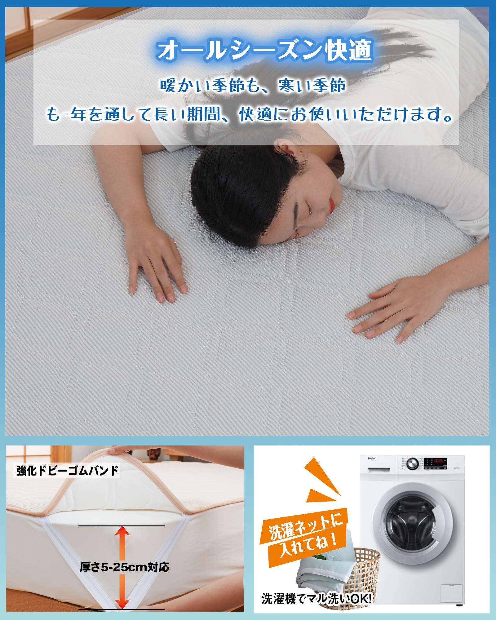 【透気性に優れた夏用】敷きパット肌に直接触れる部分には、天然素材のコットン100%に使用。表面はコーマ糸綿100%の織り糸で仕上げられ、その柔らかな質感が心地よい眠りを約束します。底部には吸湿速乾性に優れた異種構造糸を巧みに配し、快適な寝心地を提供します。最新の編み物の技術が採用され、布地の触感は非常に柔らかく、表面の微細な凹凸が、暑い日に汗をかいても、平織りの純綿生地のように身にくっつくことなく、涼やかな眠りを実現します。ベッドパッドはお客様の日常に上質な触感とスタイリッシュな快適さをお届けします。