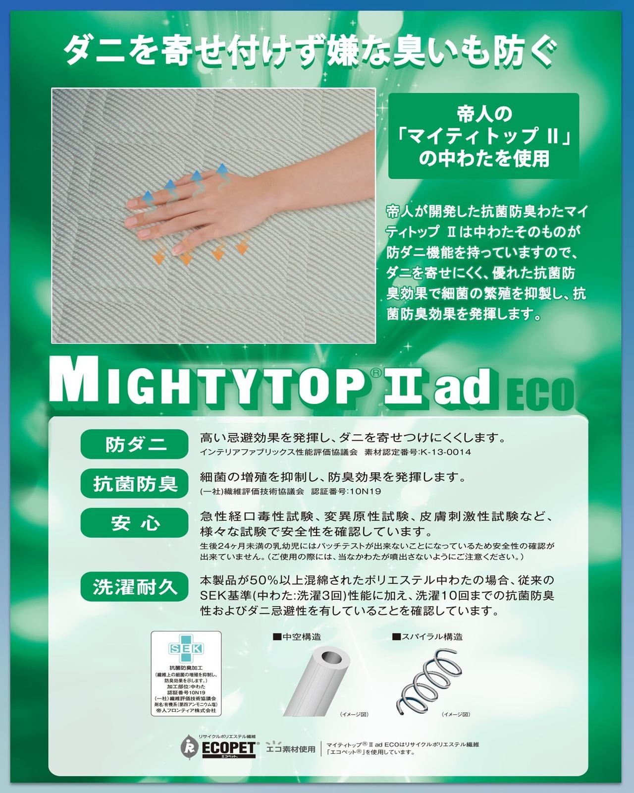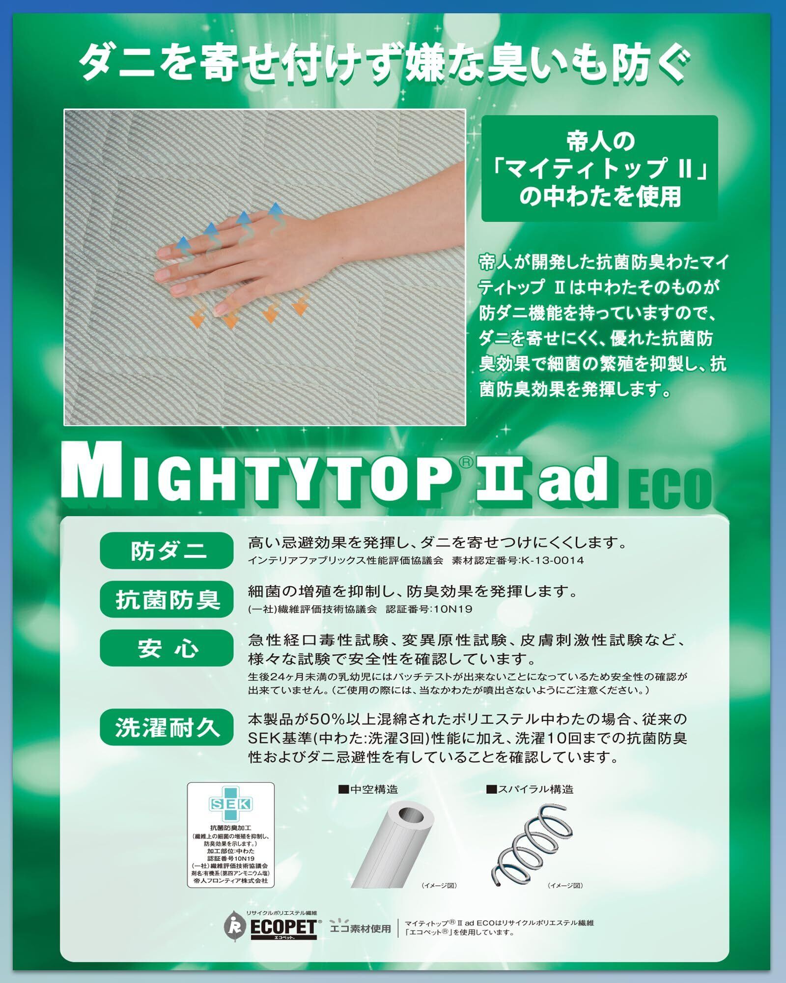 【抗菌防臭で清潔な睡眠】抗菌・防臭帝人の【マイティトップⅡ】中わたが織り成すベットパット。抗菌・防臭処理が施され、菌の増殖、汗や加齢臭など嫌なニオイを抑えます。帝人が開発した中わた【マイティトップⅡ】は防ダニ機能を備え、ダニを寄せ付けず、清潔で快適な睡眠環境をお約束します。美しい夢の中で、心地よい香りと共に、至福の眠りへ誘います。日々の疲れを癒し、優雅で幸せな眠りを手に入れましょう。