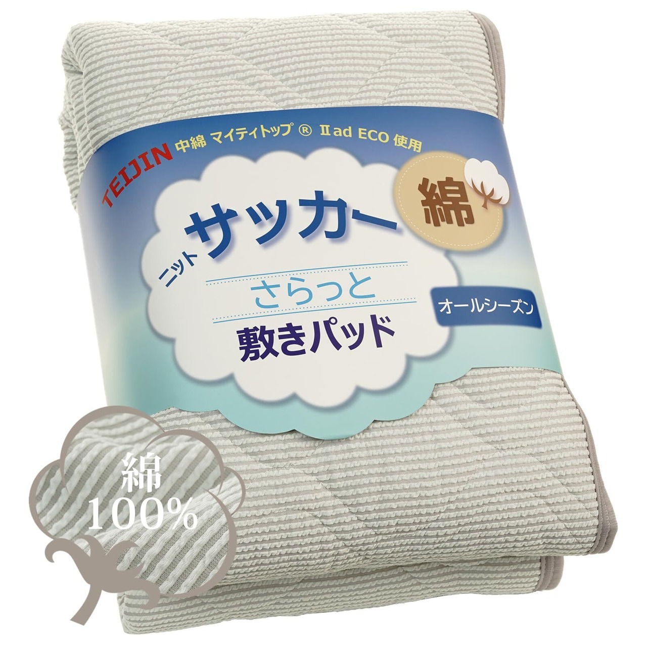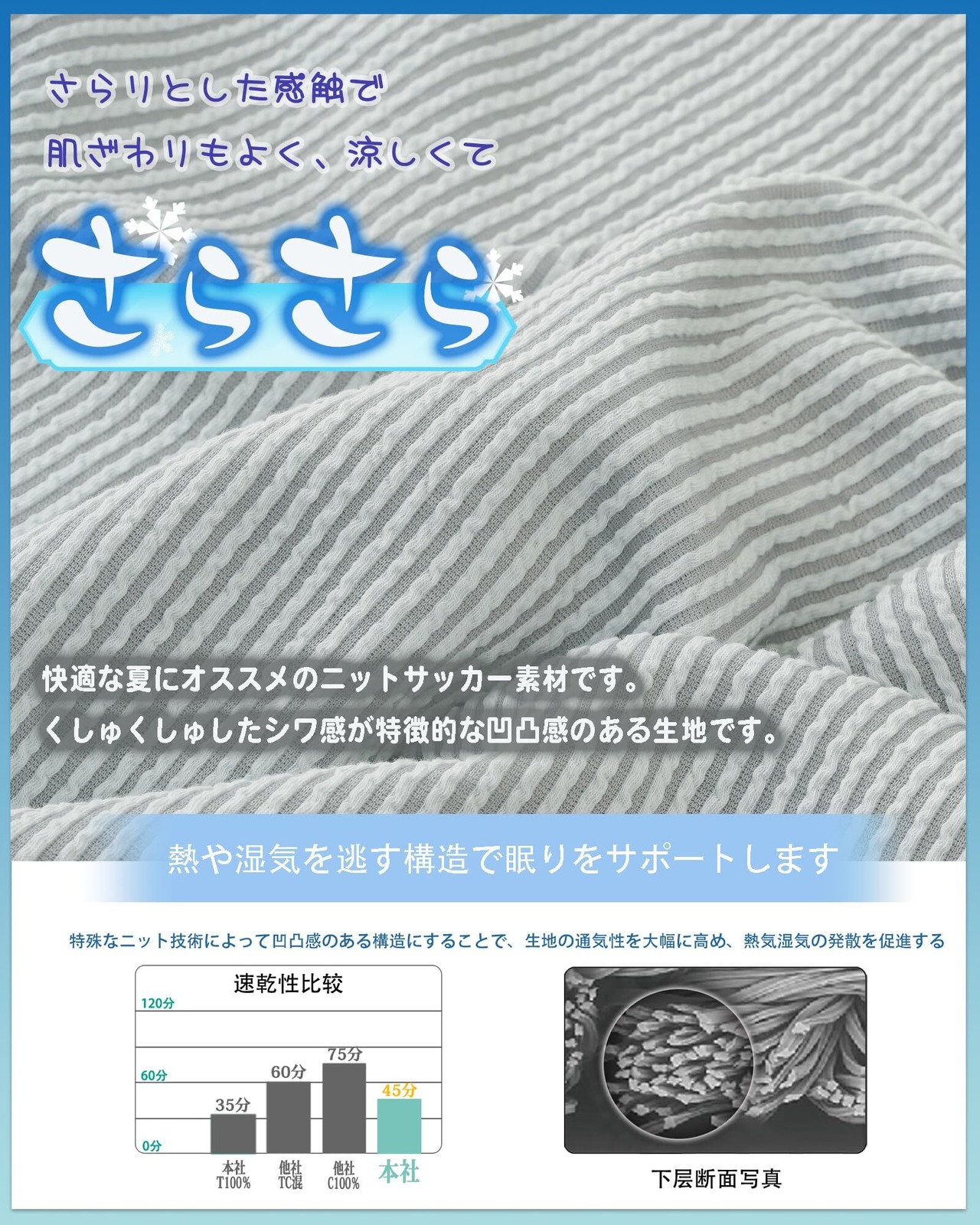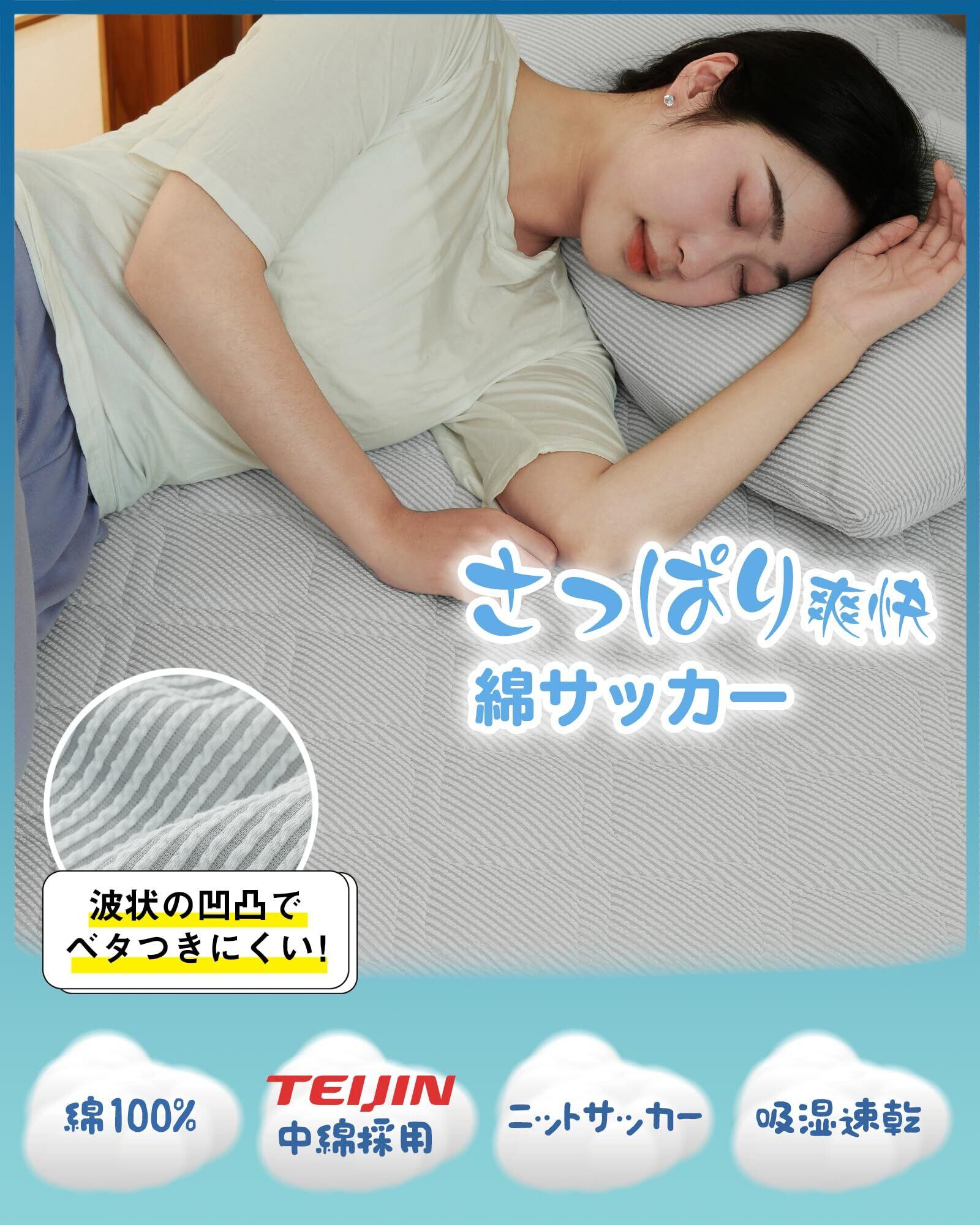 【さらさら綿敷きパッド 】柔らかなニットサッカー素材を贅沢に使用し、最新の技術で織り上げた夏用 敷きパッド。その心地よい触感はまさに至福のひとときを約束します。内部には抗菌性に優れた帝人中綿を厳選し、清潔で健康的な睡眠環境を提供いたます。柔らかい手触りと優れた通気性を持ち、身体を快適な温度に保ちます。リラックスした眠りを追求する方にぴったりの選択です。