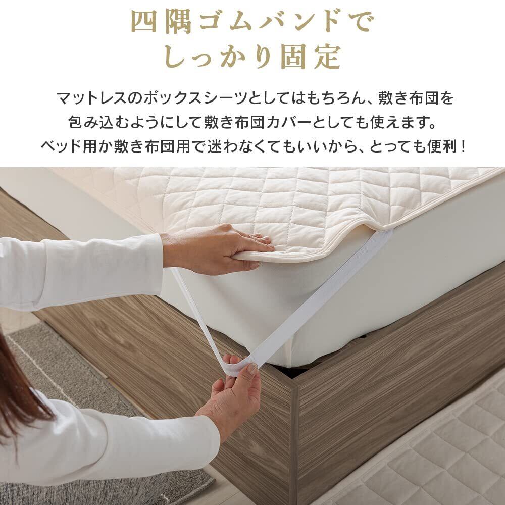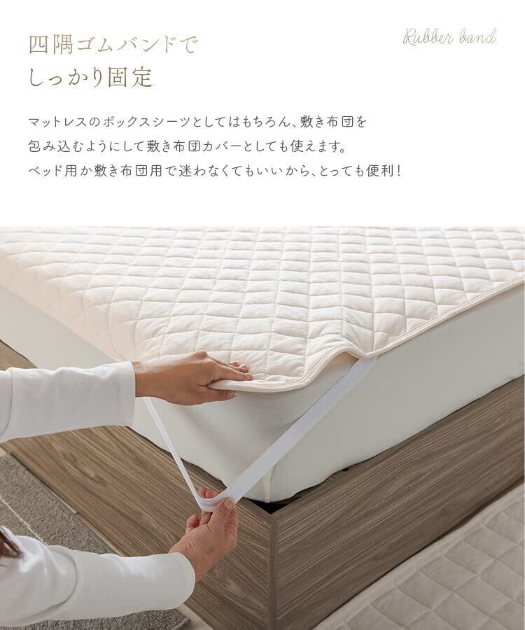 四隅ゴムバンド付きでズレにくく、マットレスにも敷布団にもお使いいただけます。