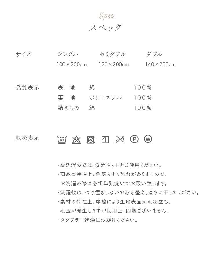 中わたも綿100%の安心設計、吸湿・発散性にも優れていて汗ばむ季節も快適に。