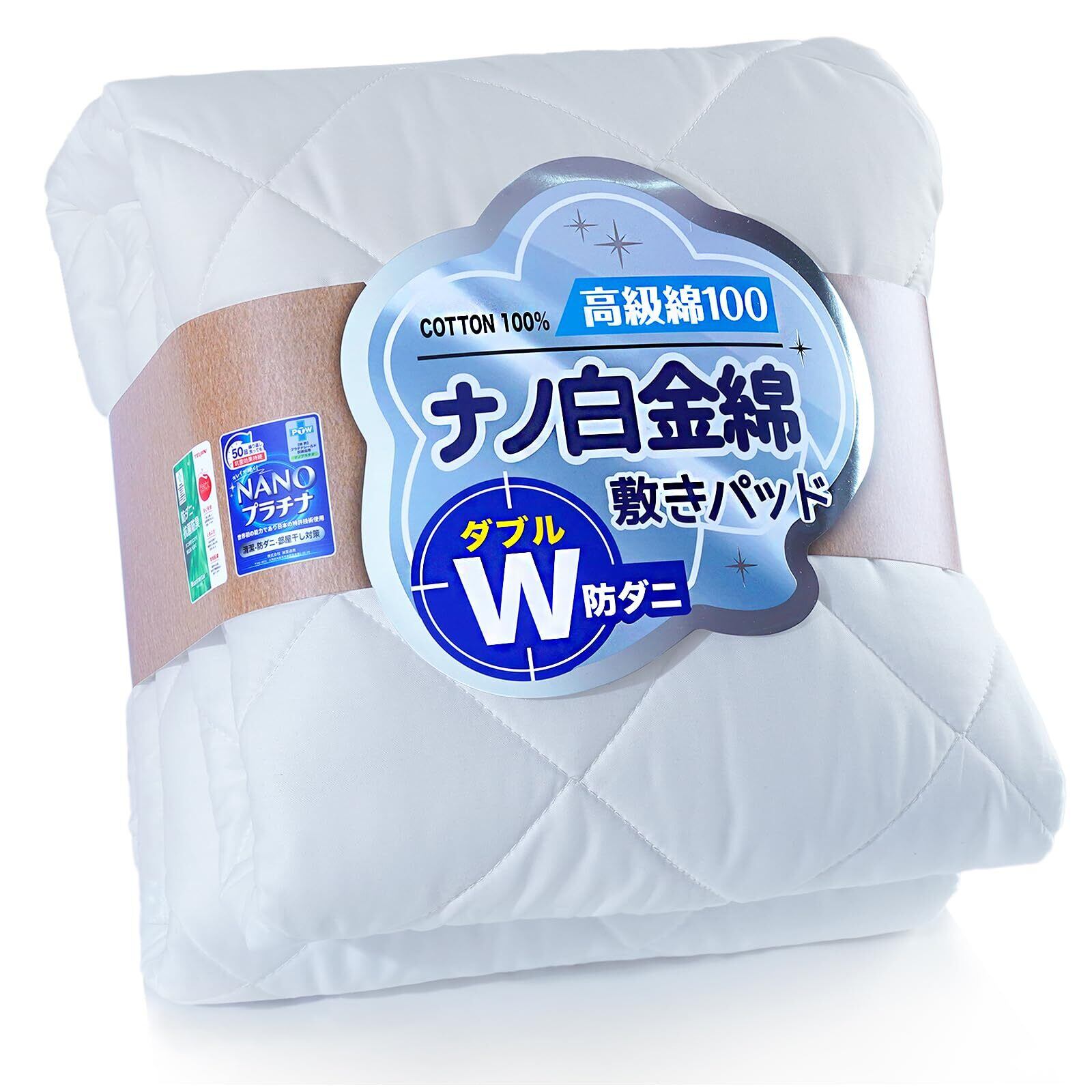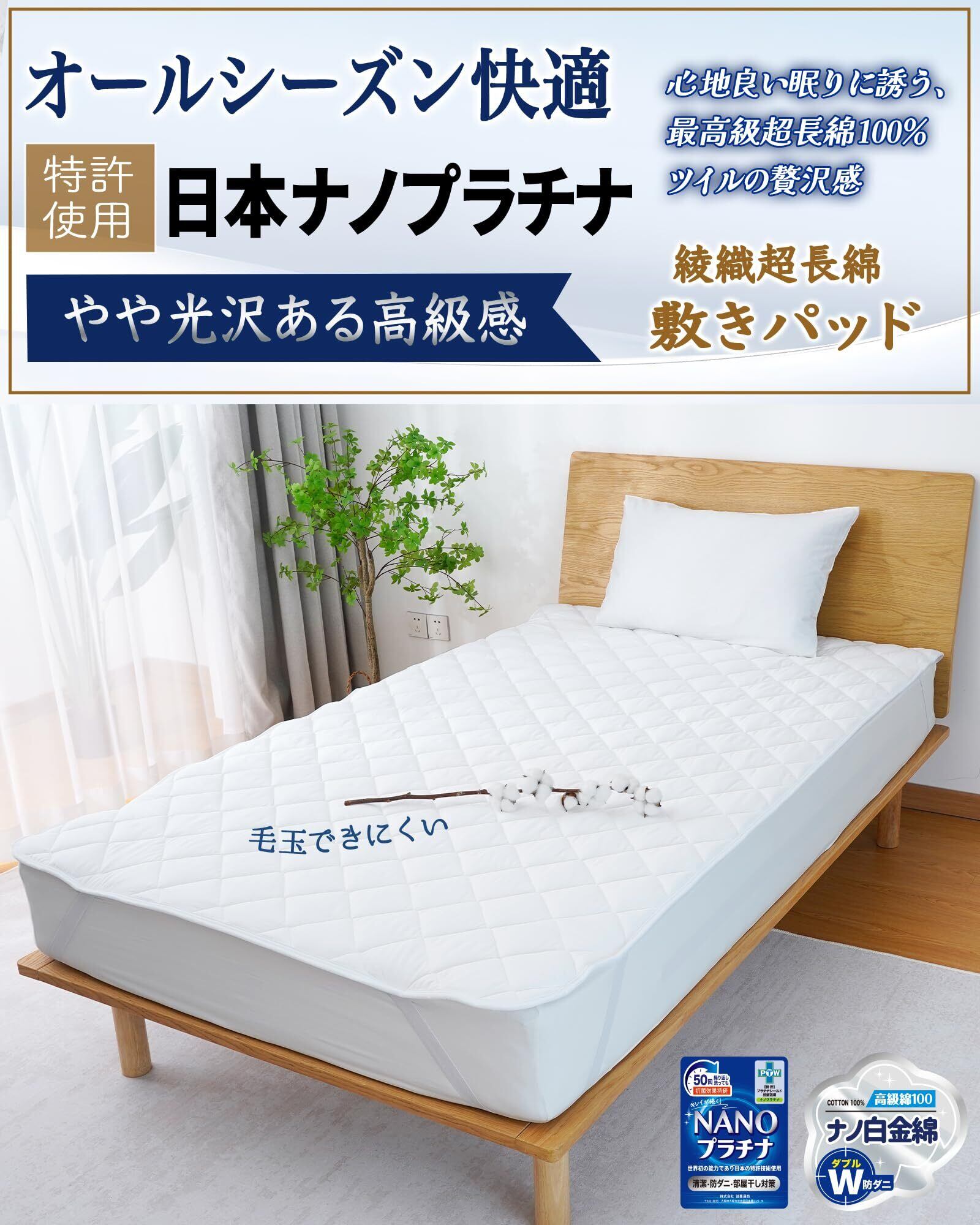 【W防ダニ アレルガード】ダ二でお困りの方にお使いいただける特別な敷きパッドです。日本ナノフラチナ使用技術と高密度ツイル織り、この2つの技術を基に、ダブル抗菌防臭防ダニ機能を追求し、ダニの侵入防止率高めております。高温多湿の日本の環境にフィットして結果抜群!肌が弱いな方やベットと一緒に寝る方もご使用いただけます。掃除の手間も省き、清潔な環境を保ちながら、心地良い睡眠をお楽しみください。豊かな眠りと朝起きたときの爽快さをベットパッドでお届けします。 【オールシーズン大活躍素材 洗濯機対応】「敷きパッド」コートン100% 暑すぎず寒すぎず、保温力が適度にあり、洗濯を重ねて使い込むほど、素材の柔らかさが増やします。春用、夏用、秋用、長い季節に心地よく使えます。<洗濯機で丸洗いOK>:折りたたんで洗濯ネットに入れれば、家庭用の洗濯機でも洗濯可能です。