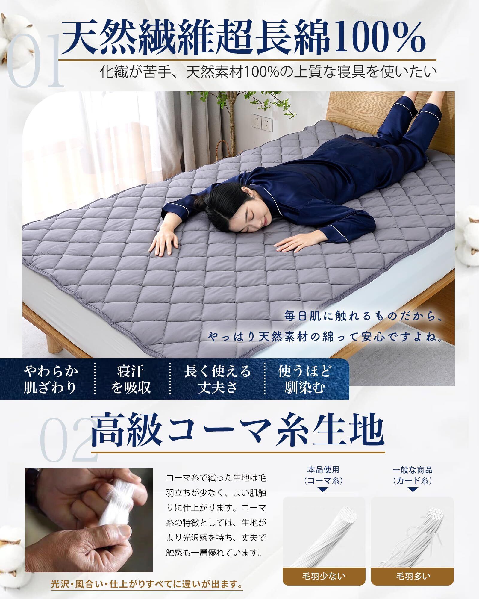 【高級超長綿100%使用・敷きパッド シングル 綿100】コットンの繊維の長さにより、短・中・長繊維綿と分類されています。長さが平均35㎜以上の特に長いものを「超長綿」と呼びます。超長綿でさらに加工し、毛玉の原因となる余分な部分を取り除き、毛羽立ちが少なくに仕上がった高級「コーマ」糸になります。上質なコットン100%天然素材であるコーマ糸で織られた敷きパッドは、めん素材ならではの吸湿性、通気性に優れ、一年中サラッと快適に過せます。また、静電気が発生しにくく、ポリエステル混紡では味わえない天然素材の柔らかさと肌触りを提供します。さらに、抗菌防臭性に優れたプラチナ(白金)を組み合わせることで、抗菌・防臭機能も持続します。洗濯を重ねるほどに柔らかくなり、肌に馴染む使い心地が特徴です。