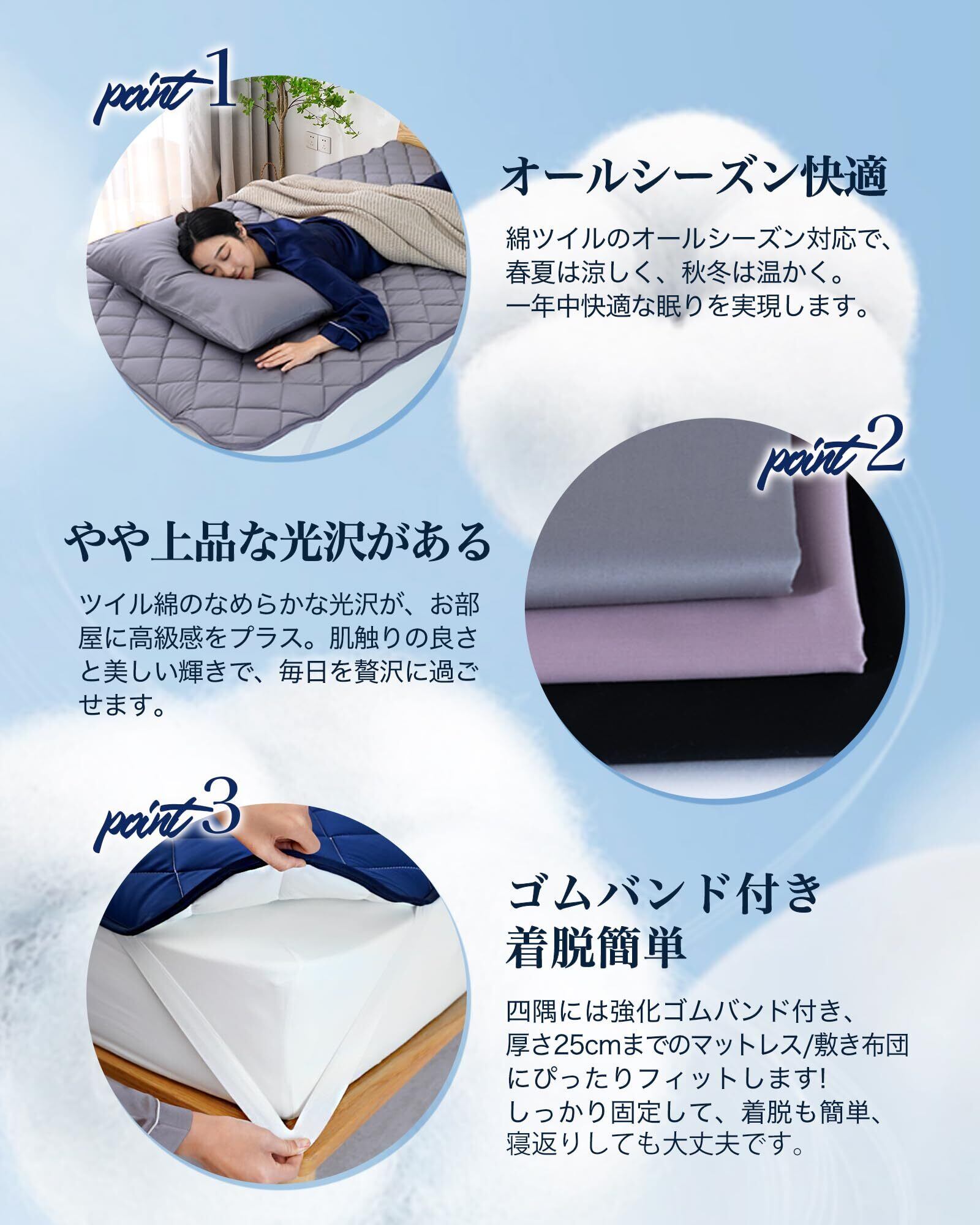 【日本ナノフラチナ使用技術】抗菌・防臭・防ダニ機能を最大限に発揮!ナノプラチナは、最先端技術により微粒子化し、優れた抗菌·防臭·防ダ二効用を発揮する新しい技術です。日本で生まれたこの革新的な技術を敷パットに贅沢に採用することで、より長時間の清潔効用を持続させ、繰り返し洗濯しても機能を持続いたします。空気中に漂う菌から部屋干し時の濡れたマットレスパッドを守ります。しきはパットは湿気の影響を受けやすく、ダニが生息しやすい寝具であるため、ナノフラチナ技術によりダニ対策を強化した設計で、睡眠中も防ダ二対策を徹底しましょう。 【使いやすいデザイン・敷きパッド シングル 綿100仕様】四隅には強化ゴムバンド付き、厚さ3~30cmくらいまでの寝具にぴったりフィットします! しっかり固定して、着脱も簡単、寝返りしても大丈夫です。