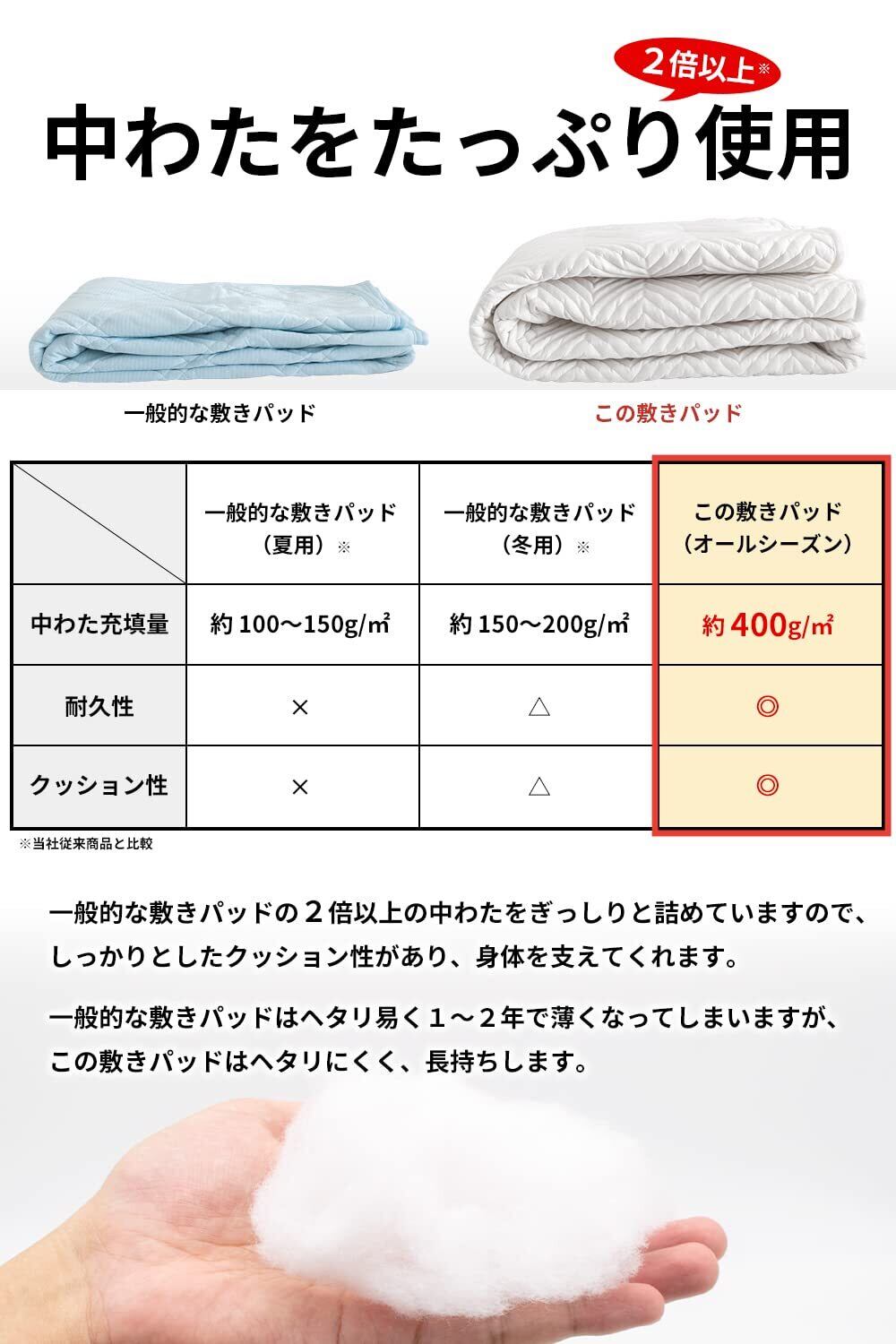 【セッティングがカンタンな「バンドタイプ」】パッドの四隅にバンドを掛けるタイプですので、セッティングがとても簡単です。一般的な敷き布団から、厚みのあるマットレスまで幅広く対応しています。また、両面とも同じ作りの「リバーシブルタイプ」ですので、どちらの面でもお使いいただけます。