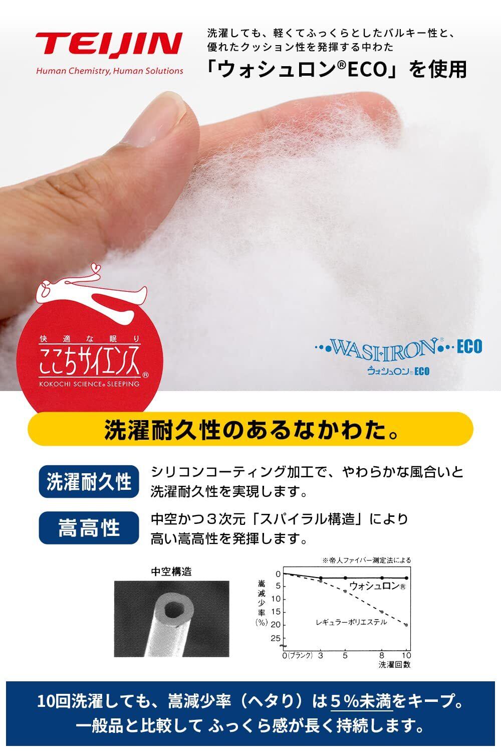 【中わたには国内有名メーカーの「帝人 ウォシュロンECO」を使用】ウォシュロンECOは特殊加工によりやわらかな風合いと洗濯耐久性を実現しています。中空繊維の3次元スパイラル構造により、高い嵩高性があり、ふっくらとしています。何度洗ってもかさ高性が落ちにくく、いつまでもボリューム感を保ちます。(10回の洗浄でもかさ高減少率は-2%)
