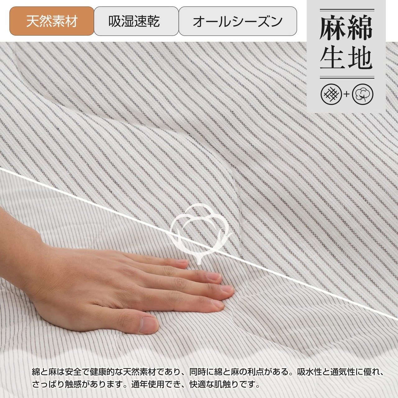 【オールシーズン向け&ゴムバンド付き】綿麻生地は人体の皮膚の汗を吸着し、体温を迅速に正常に回復させ、本当に通気性、吸汗効果を達成し、冬は暖かく夏は涼しく、肌に優しくで、四季の使用に適している。敷きパッドの四隅に滑り止めのゴムバンドが付いていて、敷きパッド をマットレスにしっかり固定できる。同じ色のゴムバンドを使用しているので、より美しくなる。お洗濯の際の取り外し&取り付けも簡単なので、使いやすくて、家事の負担も軽減してくれる。