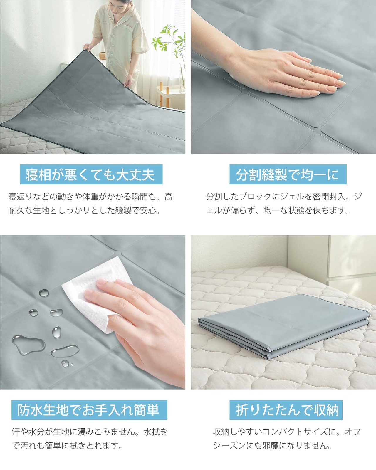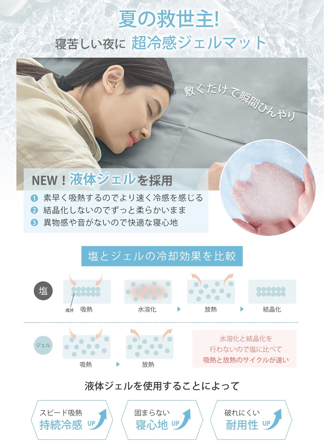 【涼しい冷感マット】暑くて寝苦しいというときには、ひんやりと快適な睡眠ができるジェルマットがおすすめです。冷感の秘密は環境に優しくジェル素材を探用し、水が周囲の温度に近づく性質を利用し、体が低温のジェルマットに触れることで体温を吸収していきます。物理原理で自然なひんやりした感じが続き、お年寄りにもお子様にも安心してお使いただけます!