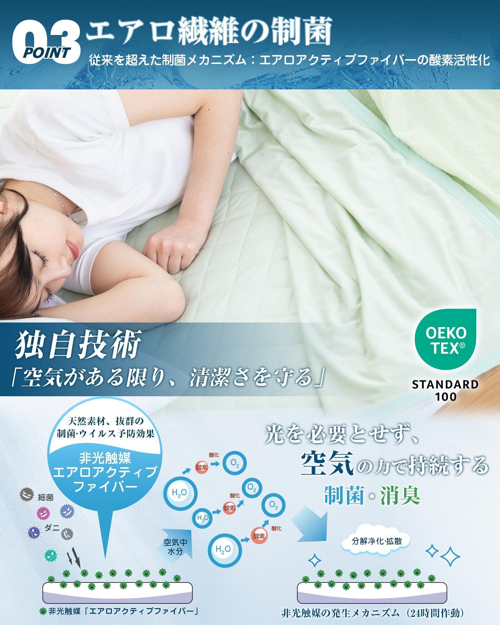【エアロ繊維の制菌】 湿気や汗でジメジメする夏は、菌が繁殖しやすい季節です。エアロアクティブファイバーの酸素活性化で、空気がある限り、24時間持続的に制菌消臭作用を発揮する。低ホルムアルデヒドなのでお子様にも安心。洗濯しても抗菌防臭・防ダニ効果は持続します。