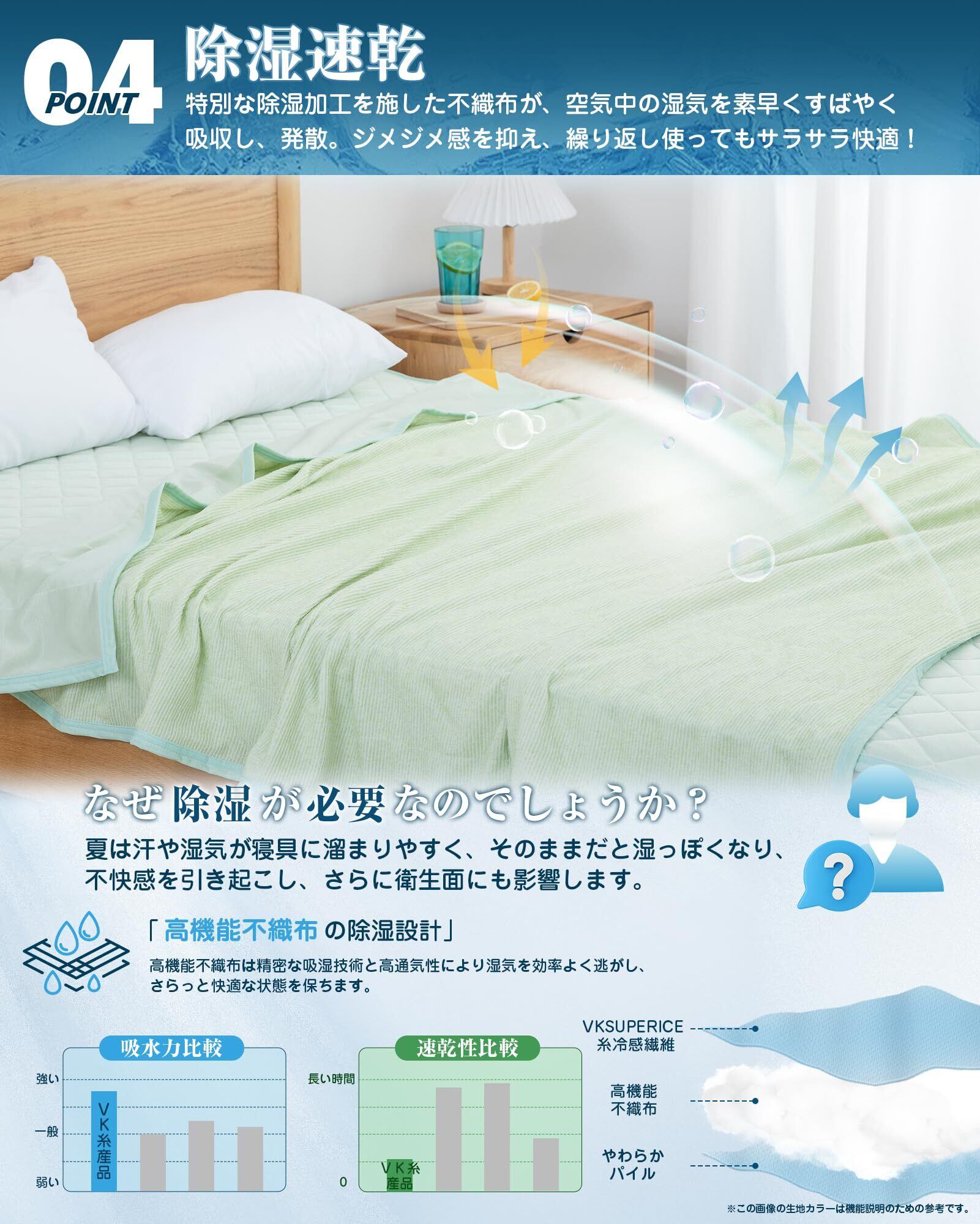【除湿速乾】夏の寝苦しさは、温度だけでなく、湿気も夏の寝苦しさの要因となる。特別な除湿加工を施した不織布が、空気中の湿気を素早く吸収し、発散する。湿度を50±5%に近づけることでじめじめ感を解消、繰り返し使ってもサラサラ快適!