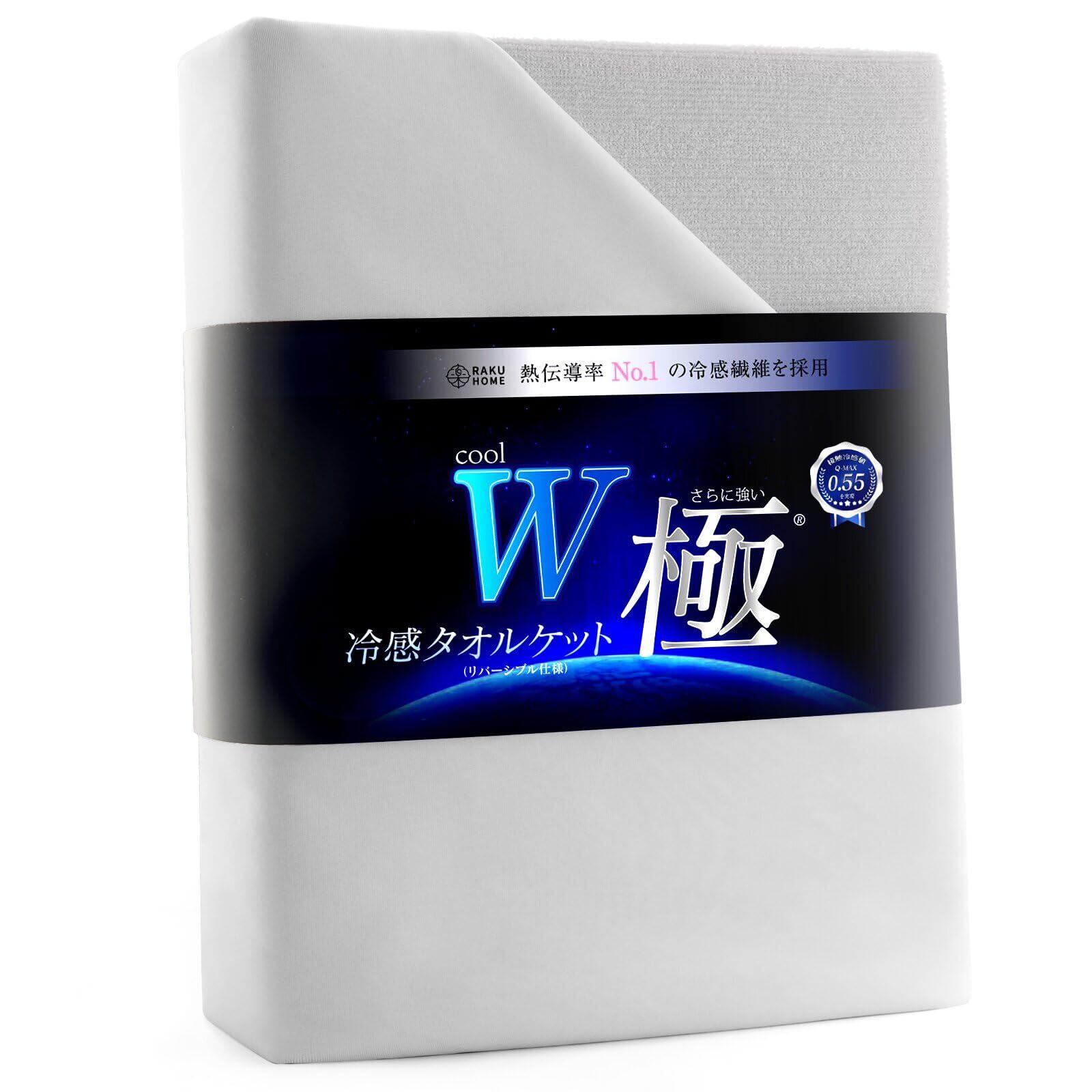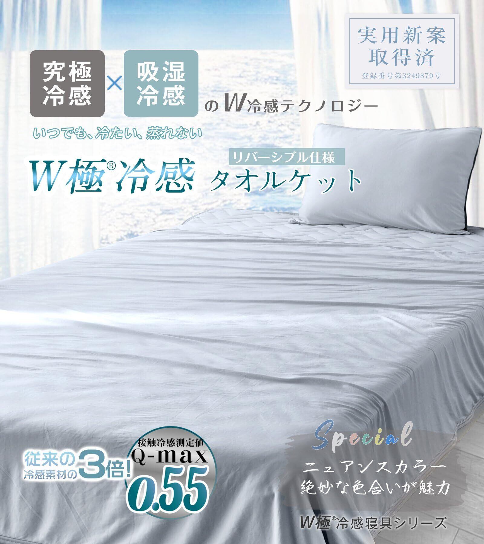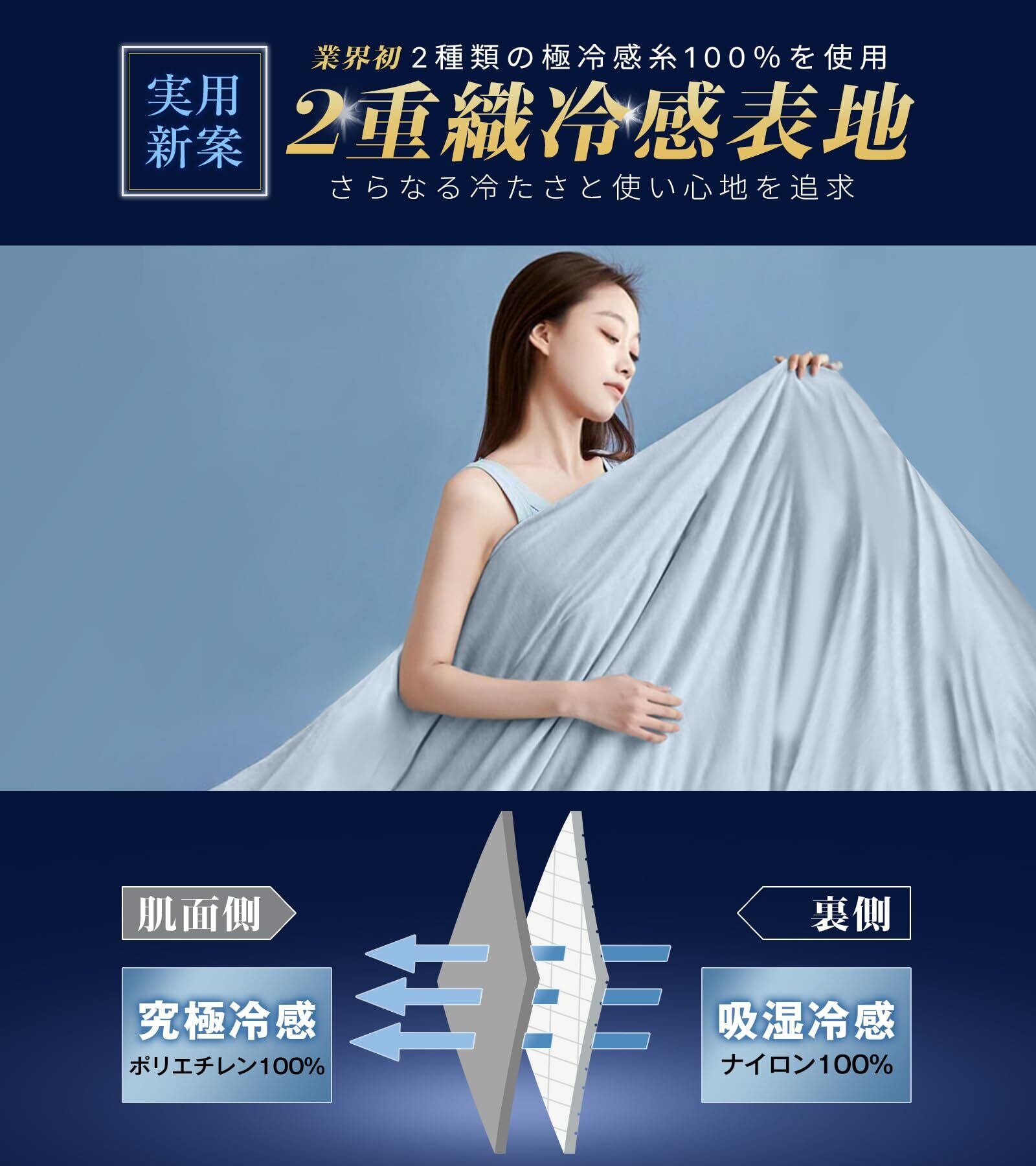 【業界最高Q-MAX値0.55 タオルケット 夏用】業界初!更なる冷たさと寝心地を求めて試行錯誤を繰り返し、ついに「究極冷感」×「吸湿放熱冷感」2種類の極冷感糸100%を独自技術でオリジナル二層構造にすることによって、業界トップクラスを誇る本物のQ-MAX値0.55を実現!さらに抜群な吸放湿性と通気性を併せ持つ(W極冷感寝具シリーズ)夏用の冷感タオルケットです。接触冷感性が群を抜いて高いポリエチレン繊維を肌に接触する側に、さらに汗をかいてもサッと吸い取ってくれる高吸放湿ナイロン繊維を裏側に配置した当社独自の2重織冷感表生地(実用新案取得済)は、従来の単一素材の冷感生地はもちろん、同じポリエチレンとナイロンを使用した混紡/複合生地とも大きく違い、繊維の使用量は2種類とも100%にしたことで、冷たさだけではなく、湿気やムレなどを極力抑え、吸放湿効果や通気効果も「最大限まで」発揮できます!寝返りするたびひんやり感がより速く回復するため、接触冷感よりも持続冷感を実現!朝まで究極なヒンヤリ感×サラサラで最高の寝心地をキープ!暑がりの方や極力冷房を使いたくない方に是非おすすめ。