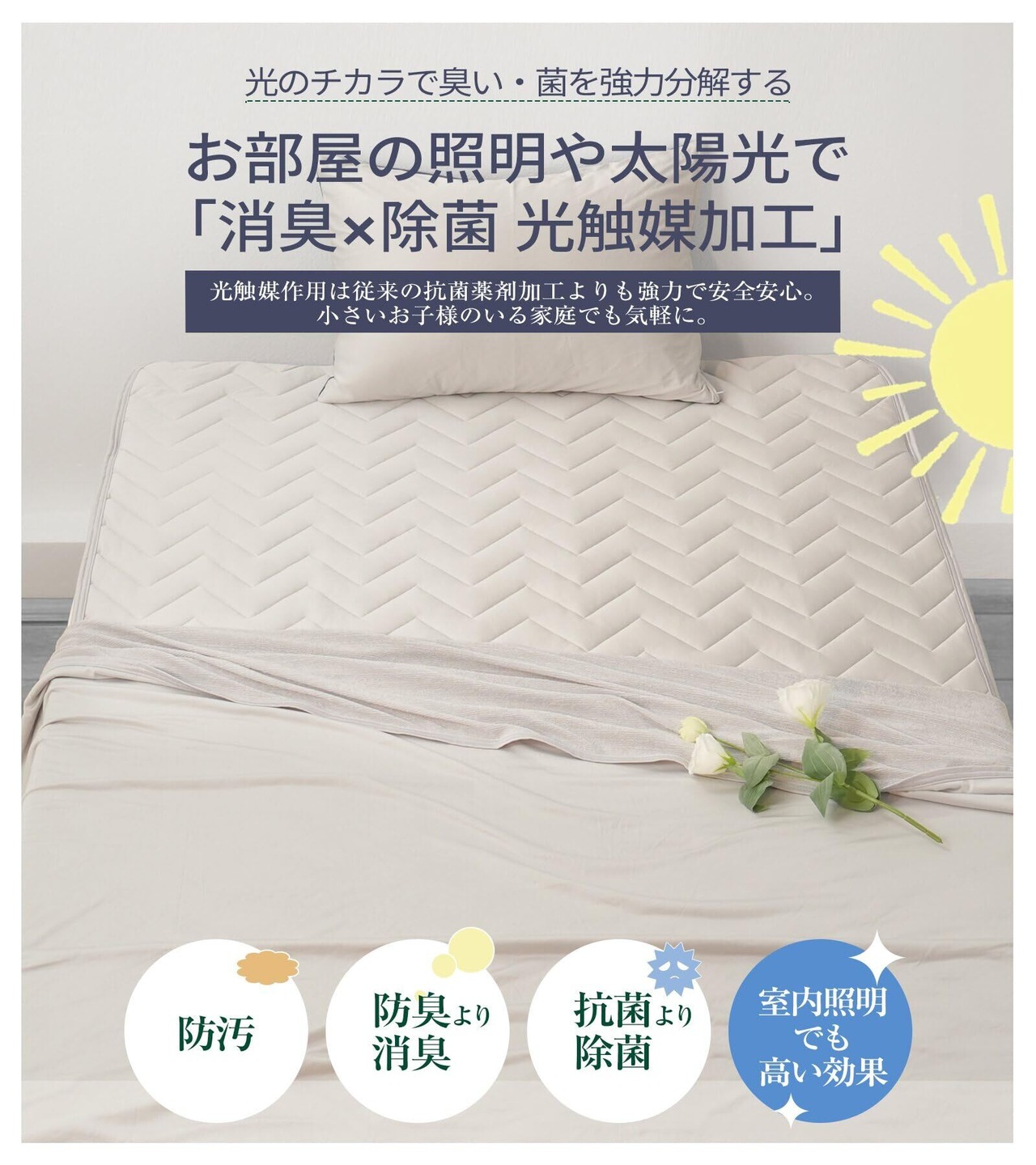 【制菌薬剤不使用!光のチカラで除菌&消臭】表地に光(太陽光や電灯の光)によって、菌やアレルゲン・臭い・ウイルスなど有害物質の吸着・分解・除去効果を発揮する光触媒加工を施しています。通常の抗菌防臭加工では消臭剤などが頻繁に使用されておりますが、W極ひんやりタオルケットは光触媒技術で抗菌防臭防ダニ作用を発揮します。さらに抗菌防臭よりも除菌消臭効果を期待できますので、お子様やペットがいるご家庭でも安心にお使いいただけます。またの光触媒の特徴は、粉状二酸化チタンを使用せず、薄膜の光触媒を生成するところにあります。市販の粉状二酸化チタンなら繊維に練り込んだりしても空気や水の勢いに流されてしまいます。膜状に生成する技術を採用することで、1000回使っても効果が続きます。