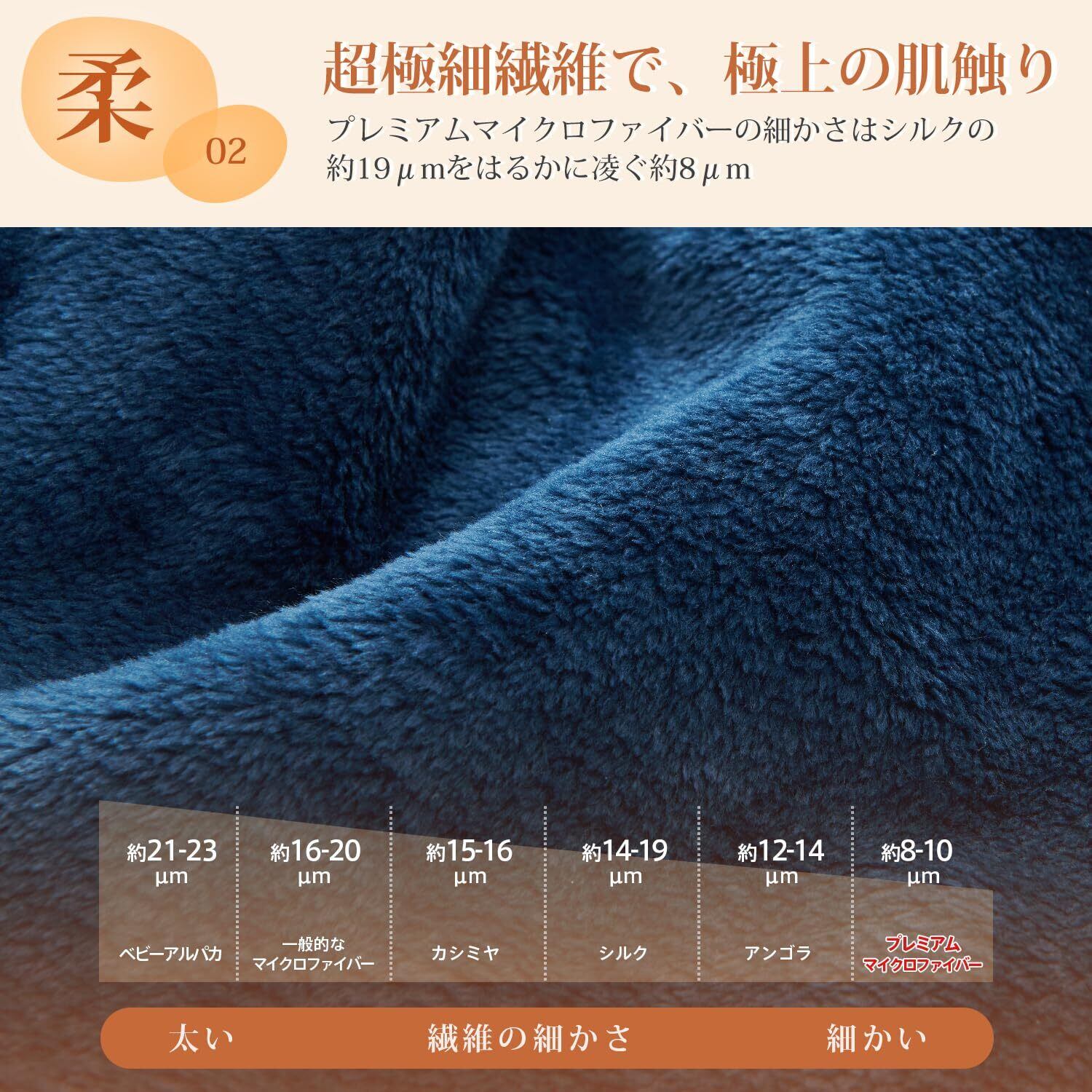 ・従来のマイクロファイバー毛布に比べて、極細繊維を使用しているため、肌触りは格別です。撫でた時の毛並みは美しい。その違いを肌で実感頂けます。