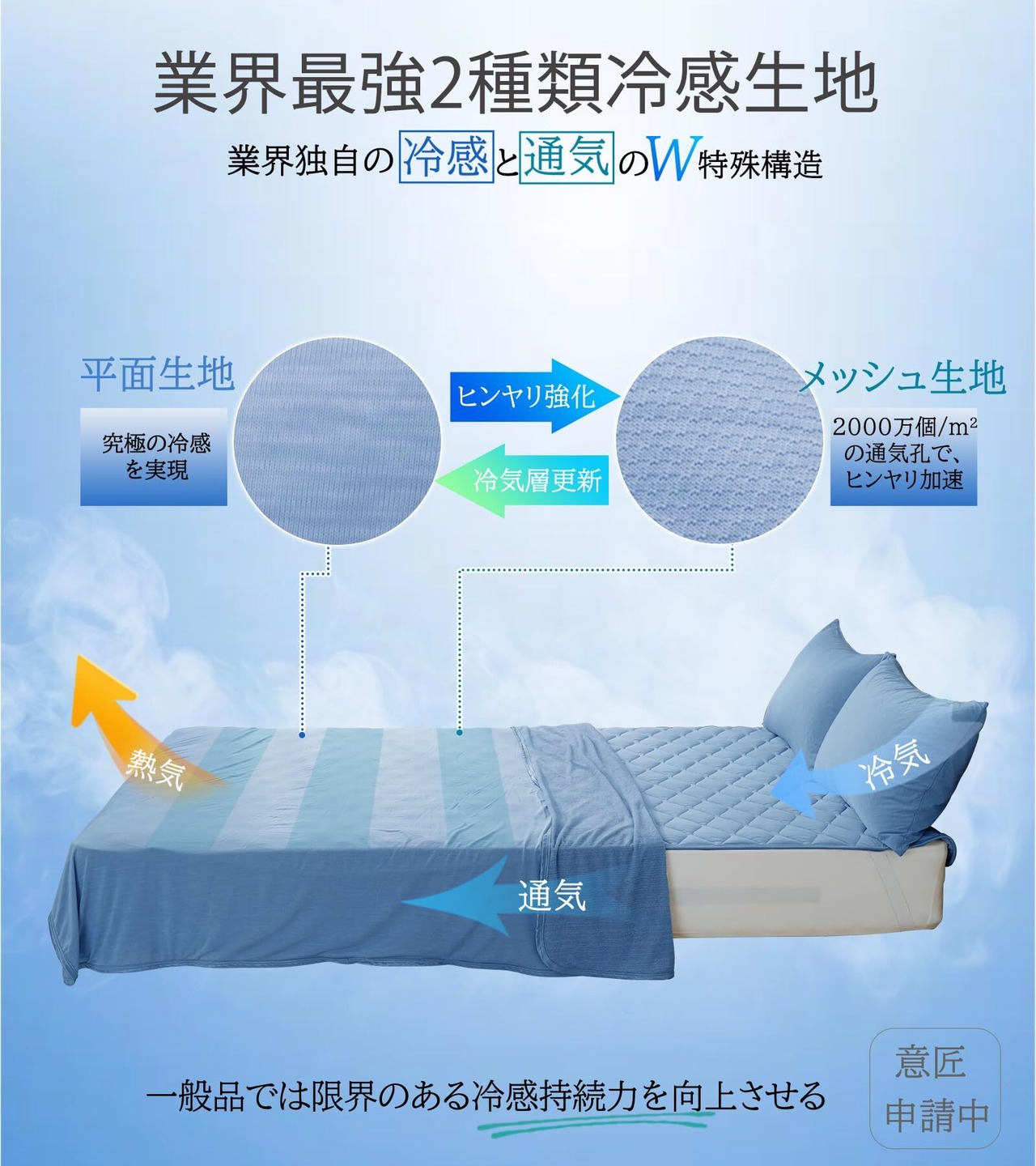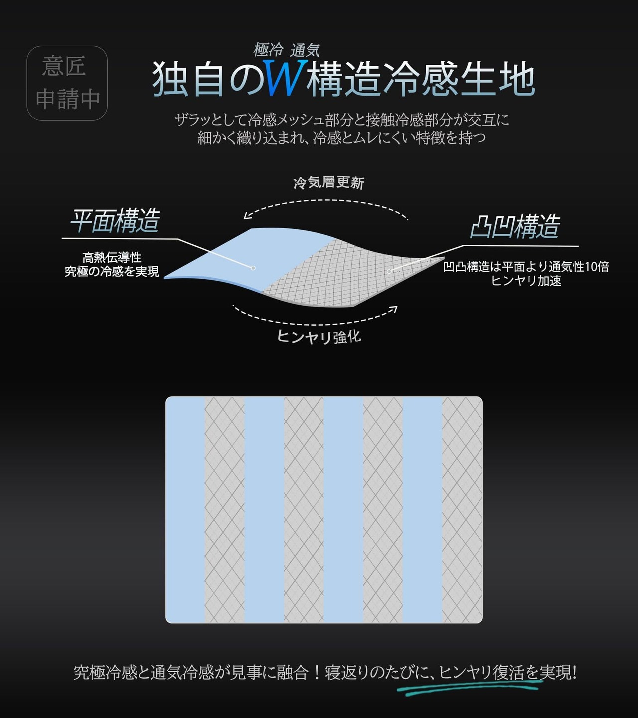 【持続冷感、通気冷感を両立する特殊構造体|夏の睡眠を革新する接触冷感 タオルケット】 近年、夏季の高温多湿化が進む中、寝具には接触冷感機能と発汗処理機能を併せ持つ複合型快適技術が求められています。従来技術では、接触冷感の向上には肌との接触面積を増やす必要があった一方、汗によるベタつき防止には接触面積の削減が不可欠であり、両立が難しい状況でした。この矛盾を克服する次世代冷感素材を開発しました!本素材には、平面構造部で瞬時に冷却し、凸凹構造部で湿気排出を促進する「マイクロエアフローシステム」を搭載しております。温度差による気流循環により、従来の夏用タオルケットと比較して2.7倍の放熱効率を実現します。3D凸凹構造により肌との接触面積を27%削減することで、熱力学と流体力学を融合させた「冷感テクノロジー」が、夏の快適な睡眠のための新たな基準を確立します。接触冷感と吸放湿の両立を実現したひんやりタオルケットは、朝までサラサラの快適さを約束できます。まさに「最強の冷感 タオルケット」と呼ぶにふさわしい革新仕様です。