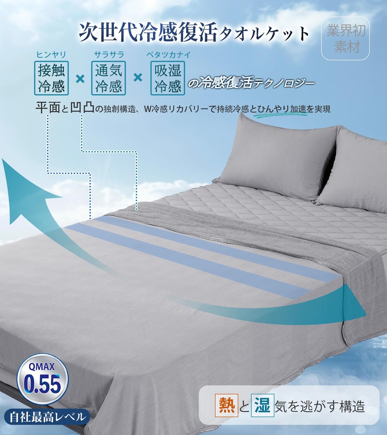 特徴 ひんやり×レーヨンパイル, 両面使い冷感タオルケット, 触れた瞬間にひんやり QMAX0.554, 通気