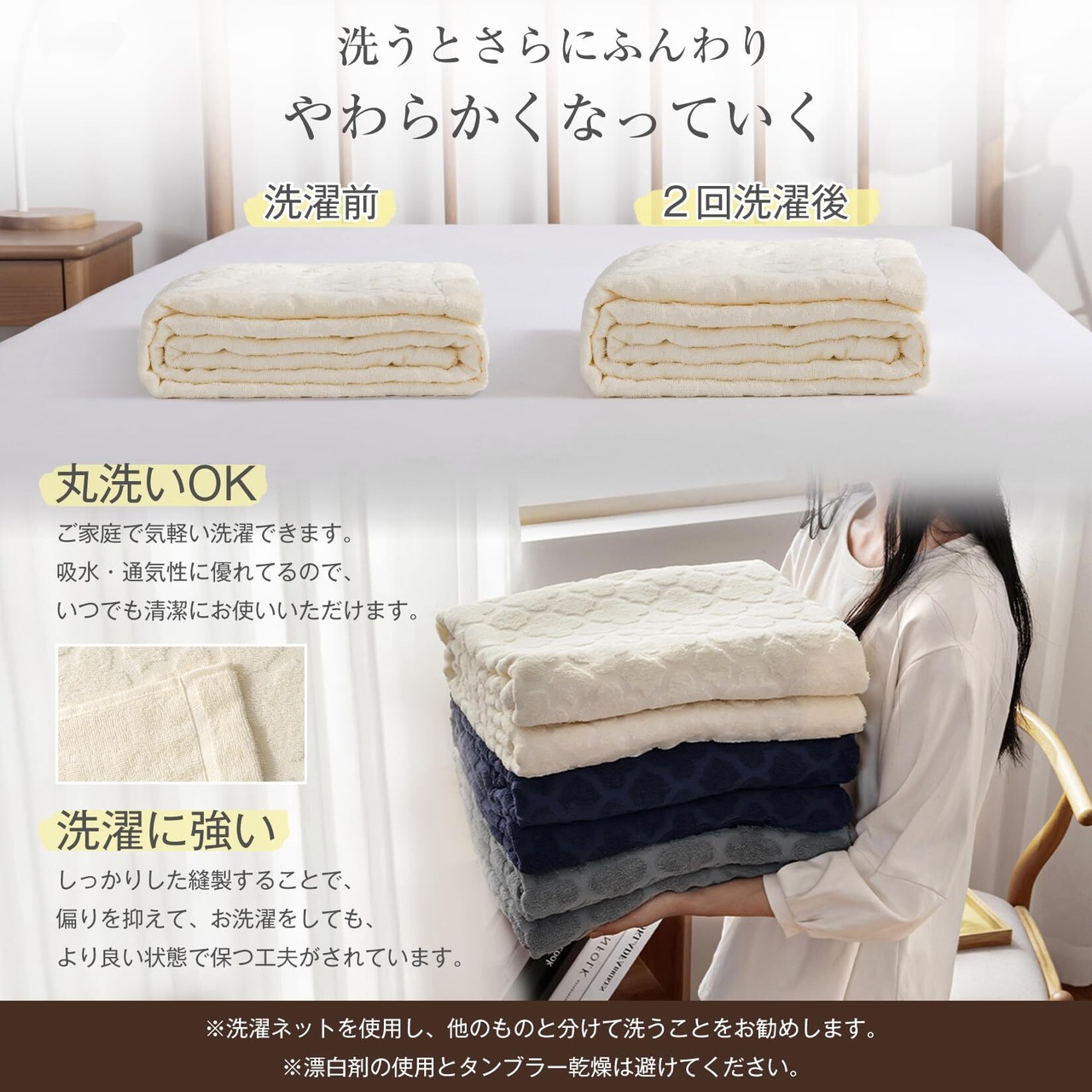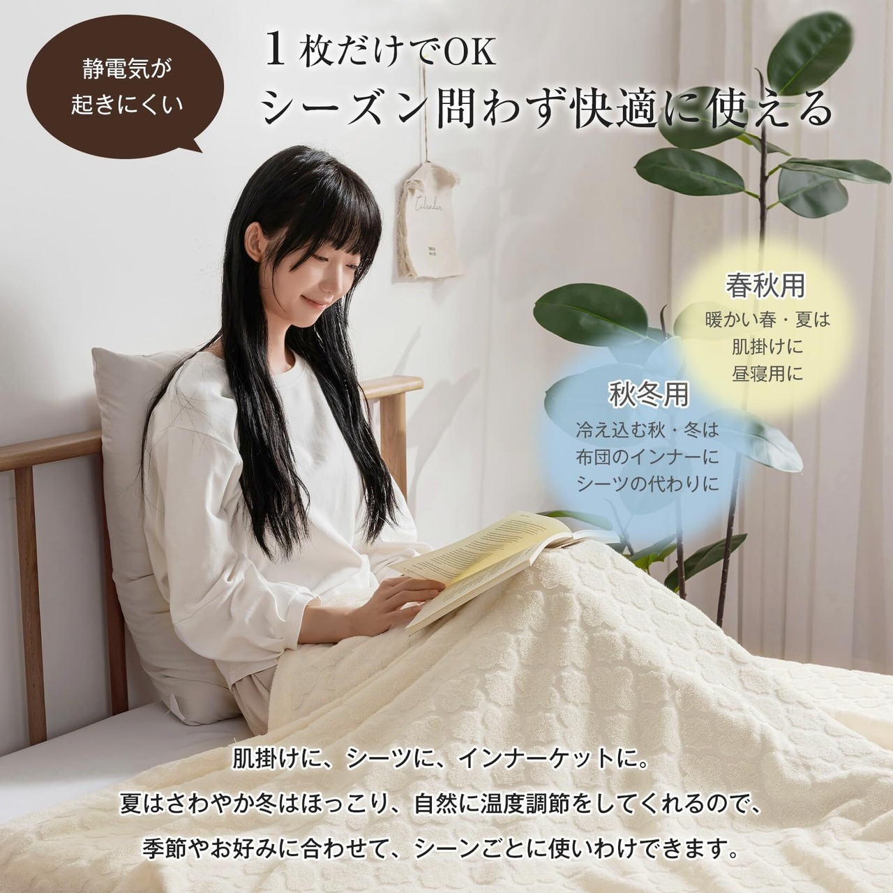 【一年中使えるほどよい厚手感】適度な弾力とボリューム感も兼ね備えているため、シーツとして下に敷くことも、かけ布団代わりに体を包むこともできます。素肌で心地よさを実感できる寝具として、オールシーズンおすすめです。