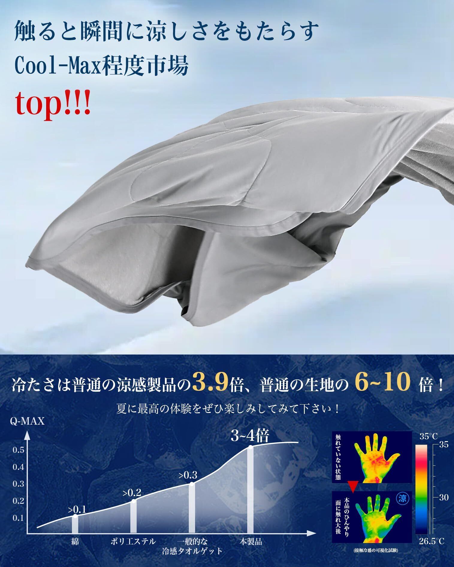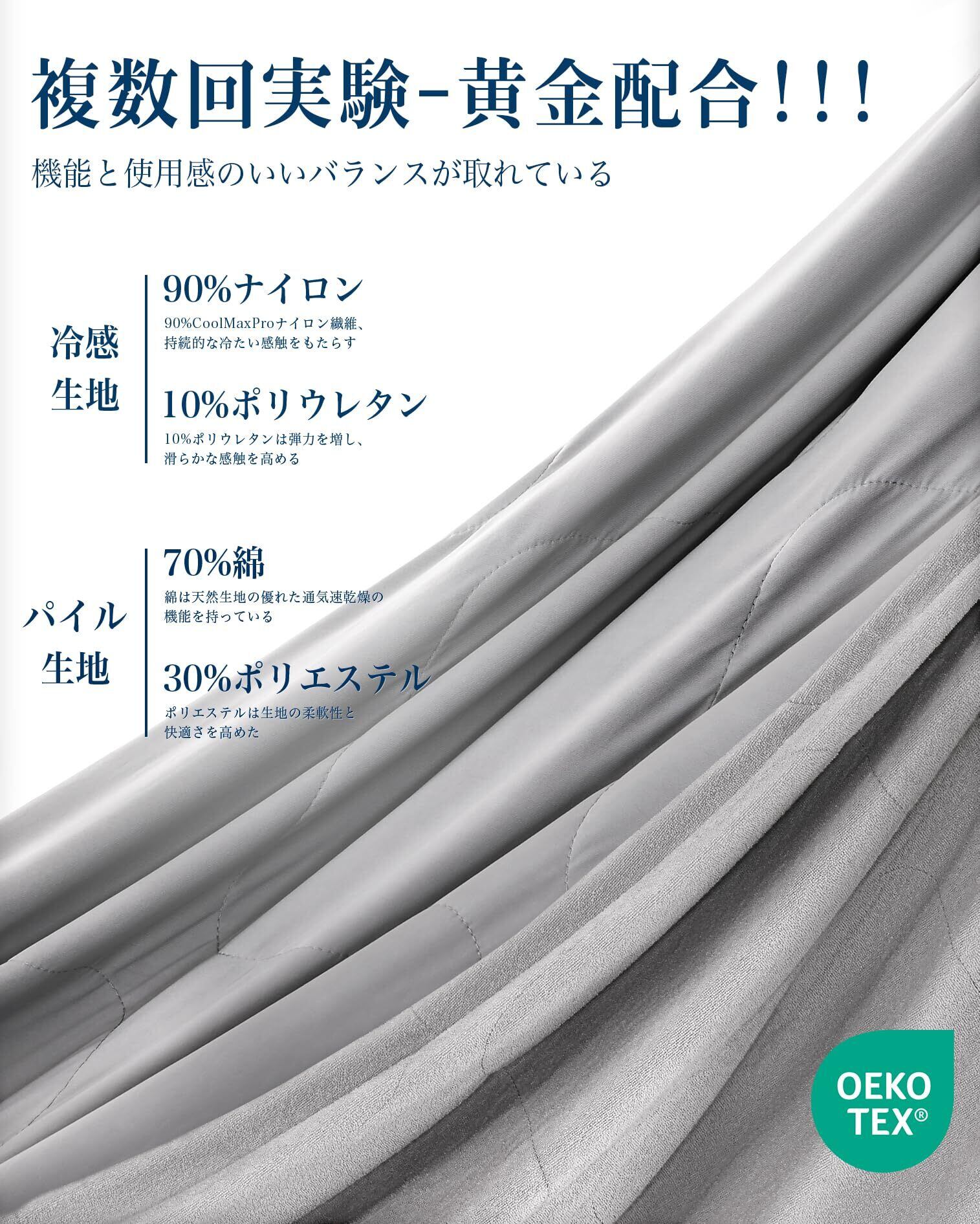 【両面構造|片面はひんやり冷感、片面はふんわり吸汗。お好みに合わせて使い分け】 本商品はリバーシブル仕様で、表側はCoolMaxPro接触冷感生地(ナイロン90%+ポリウレタン10%)、裏側はパイル地(綿70%+ポリエステル30%)を採用。 裏側の綿混パイルは柔らかくて汗もよく吸収し、ベタつかなく快適です。