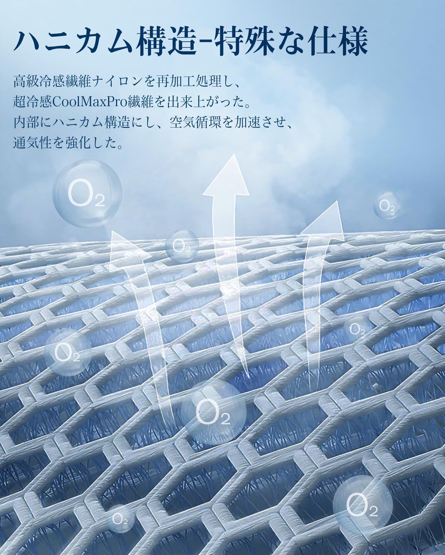 【効率的な熱伝導構造|“ひんやり”が速く、しっかり肌に届く】 CoolMaxPro生地は、冷感効果を最大限に引き出すために繊維配合や編み密度を最適化しています。 ナイロン90%の高配合で優れた熱伝導性を実現し、10%の弾力糸が伸縮性とフィット感を高め、肌への密着性がアップ。冷感成分や加工に頼らず、自然な素材で安心かつ長く使える冷感性能を提供します。