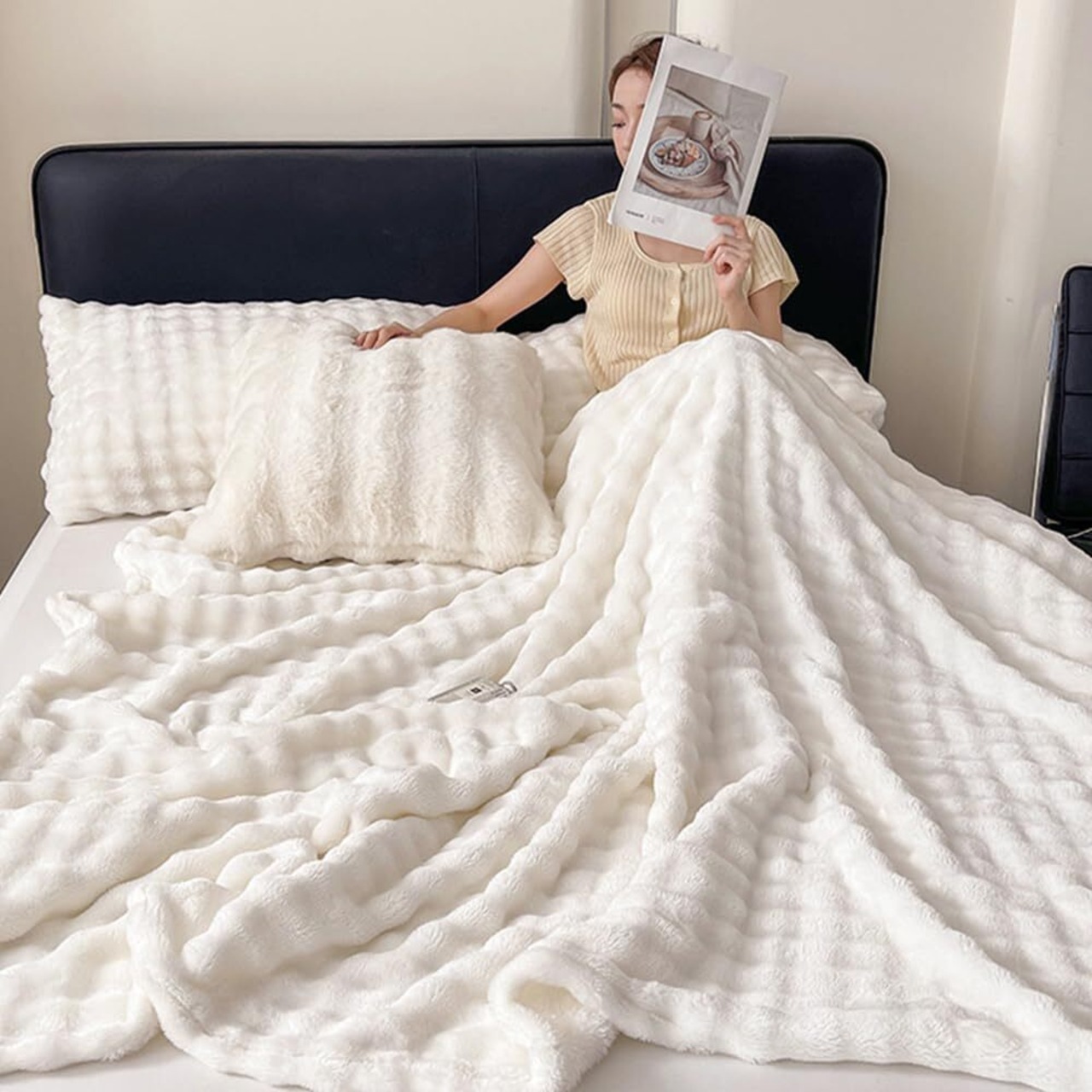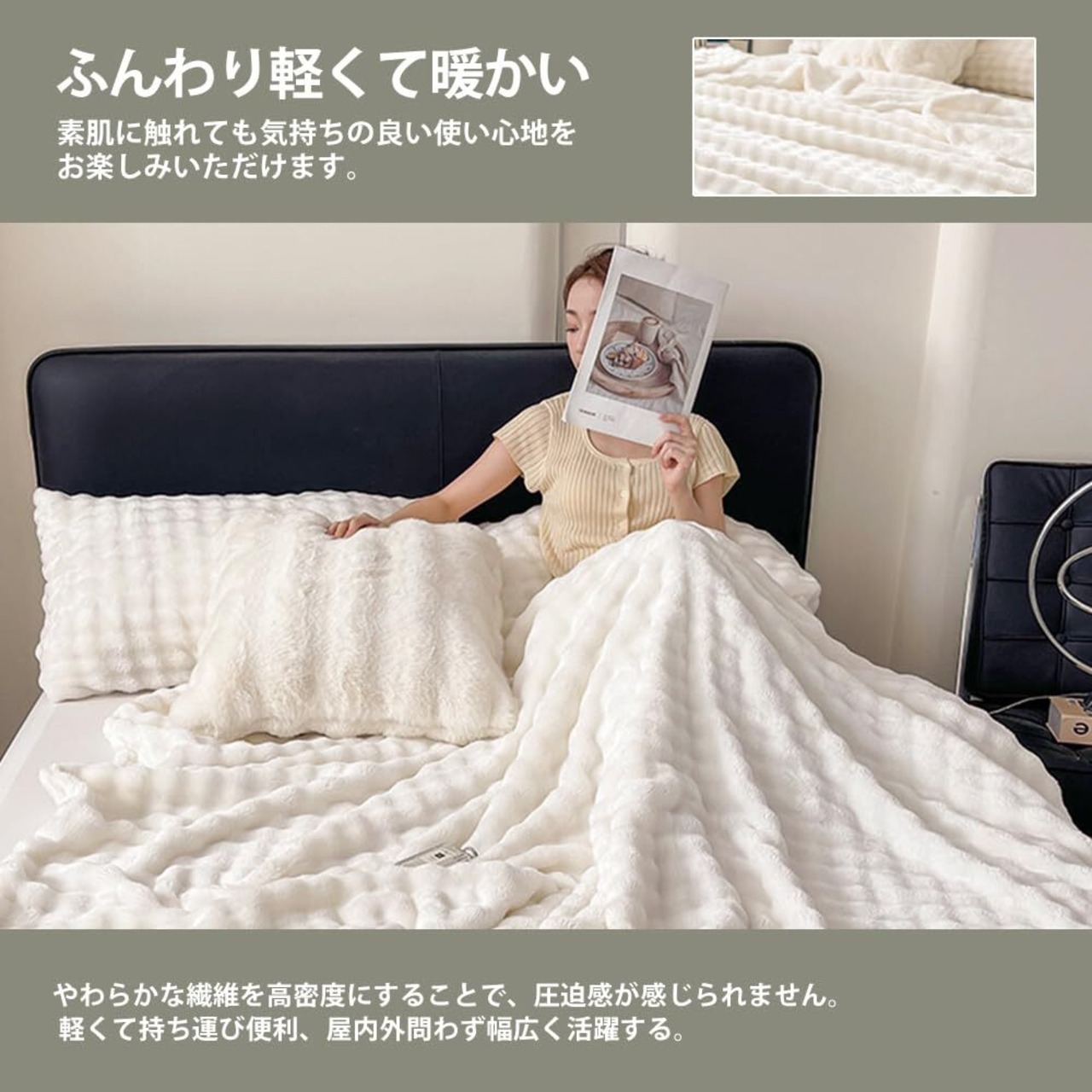 【夏向けふわとろ毛布】ラビットファー調加工薄手毛布、ふんわりとしたなめらかな肌触り、高級感up、保温&吸湿&通気性良い、おしゃれなお部屋を演出してくれ、冷房対策、春夏秋冬一年中でも快適にお過ごしいただけるブランケットです。立体的な凹凸のあるデザインが、優雅で洗練されたスタイルを引き立てます。