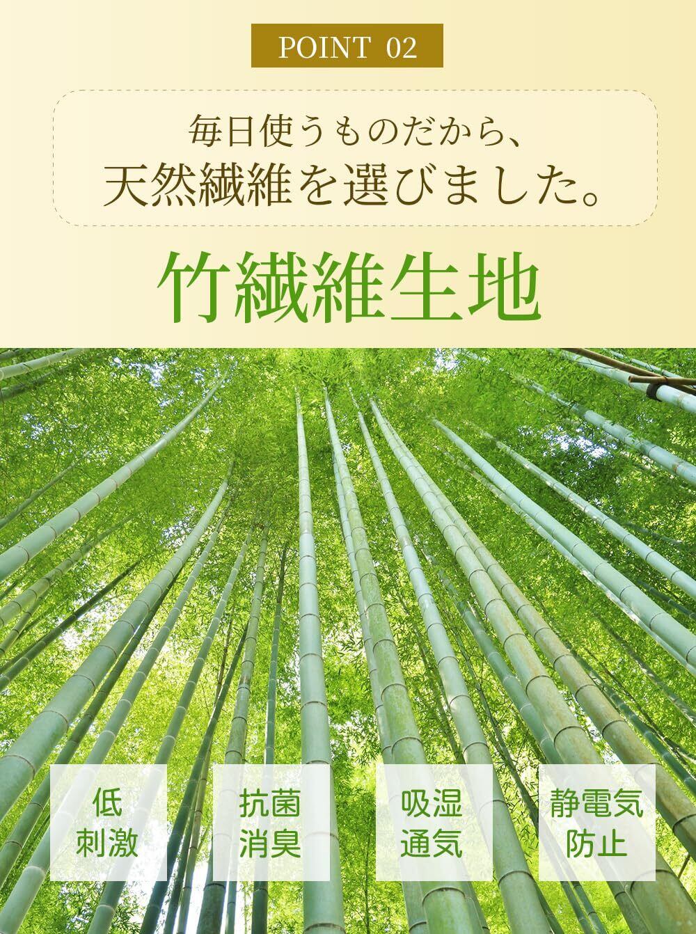 【竹繊維をお勧めする理由】①菌の繁殖を防ぐから、何度使ってもずっと清潔。嫌なニオイが発生しない、天然の抗菌剤です。②静電気の発生が、限りなくゼロに近い!③綿の2倍の吸水力!表面全体で汗や水分をぐんぐん吸い取ります。④遠赤外線発生量が、トルマリンとほぼ同じ。