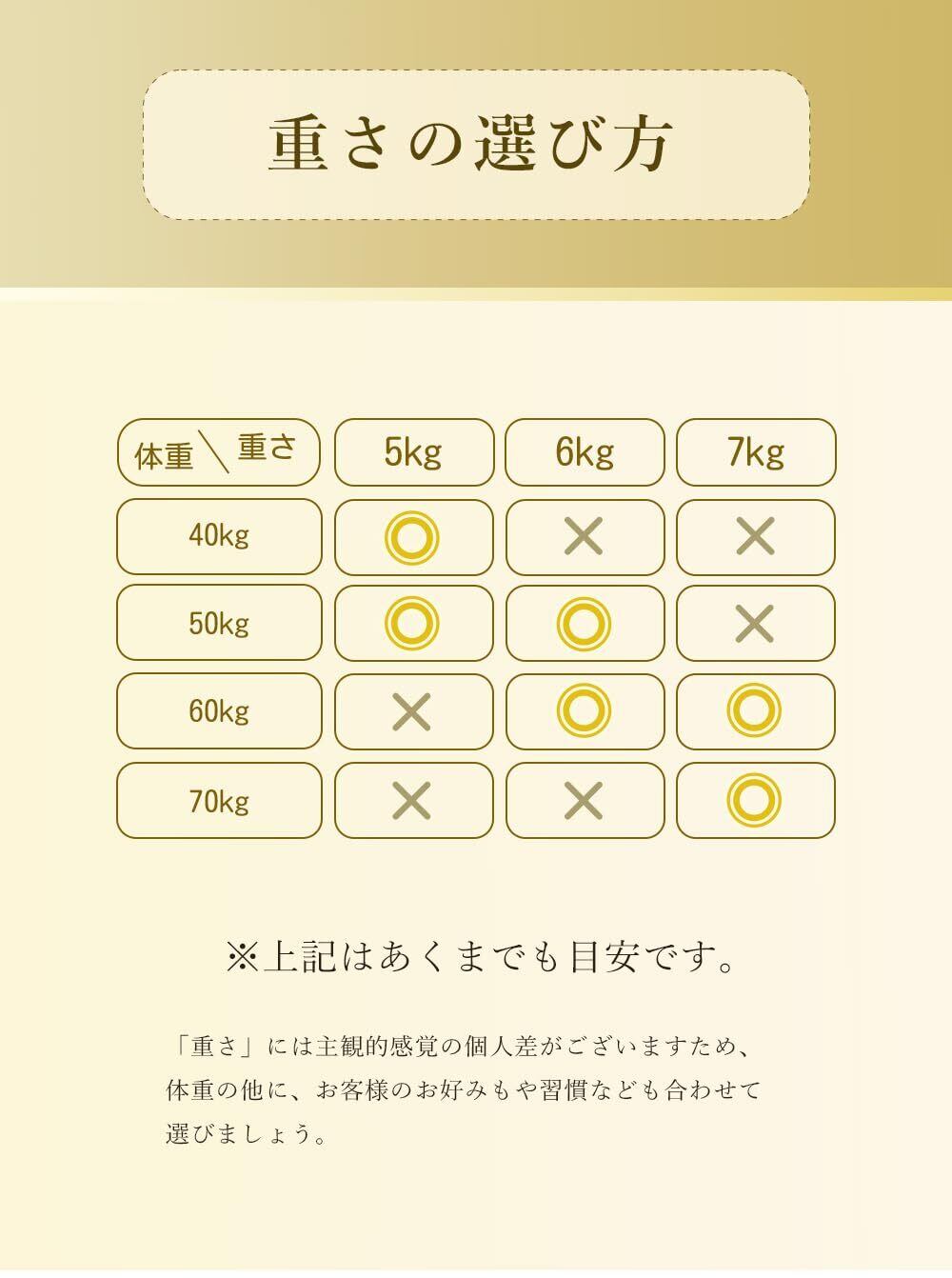 【重さ選びについて】重力ブランケットを選んだとき、自分の体重の10%+1kgの重さがおすすめです。5kg(体重範囲 40kg~50kg)、6kg【体重範囲 50kg~60kg】、7kg【体重範囲 60kg~70kg】。ブランケットサイズ:150×210cm(シングル布団)