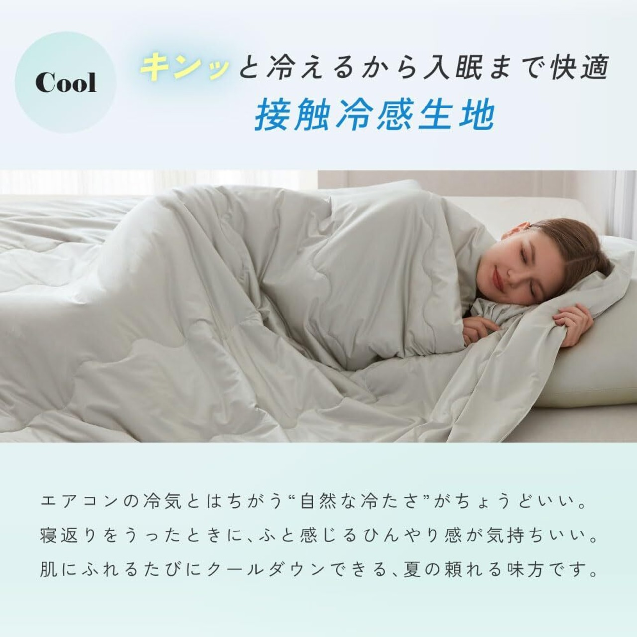 ■キンッと冷えるから入眠まで快適 接触冷感生地。 エアコンの冷気とはちがう"自然な冷たさ"がちょうどいい。 寝返りを打ったときに、ふと感じるひんやり感が気持ちいい。 肌にふれるたびにクールダウンできる、夏の頼れる味方です。