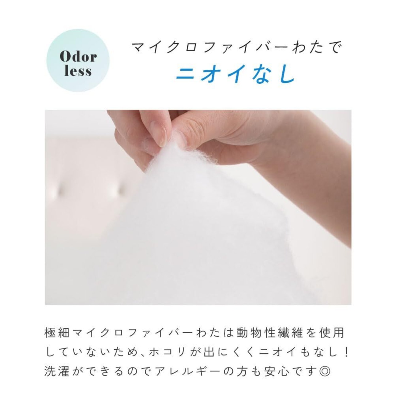 ■マクロファイバーわたでニオイなし。 極細マイクロファイバーわたは動物性繊維を使用していないため、ホコリが出にくくニオイもなし! 洗濯ができるのでアレルギーの方も安心です◎