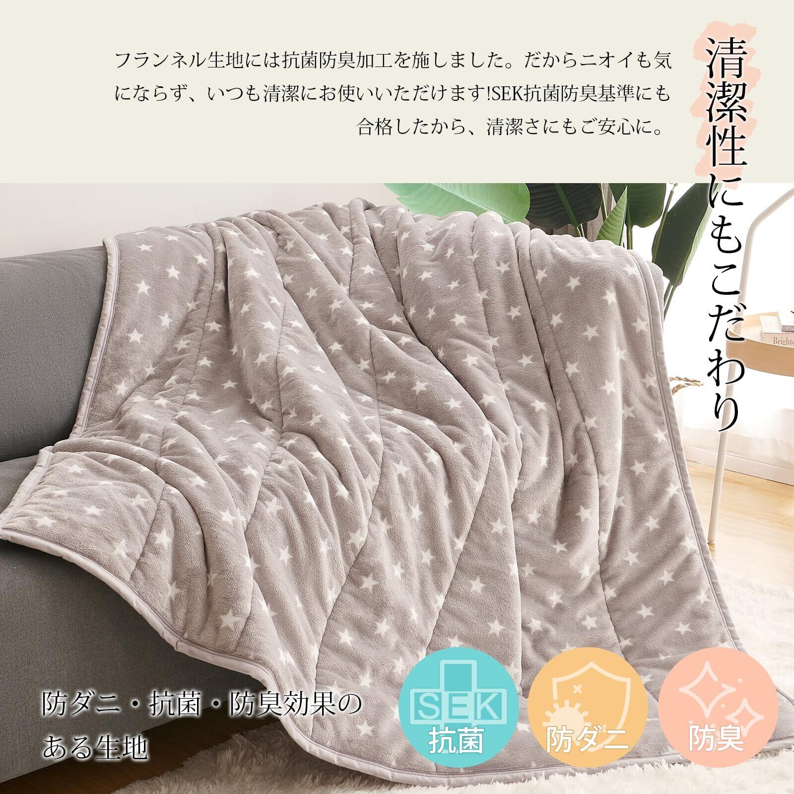 【静電気防止·毛布】 静電気防止の加工を施しているので、空気が乾燥している秋冬にも、安心にお使いいただく。また、二重に縫製しているキルトがはずれにくく、何度洗濯しても型崩れしない。