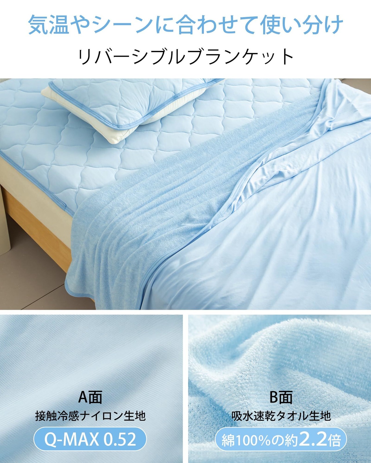 【両面タイプタオルケット!!Q-MAX0.52冷感】表地は接触冷感ナイロン生地で、触れるとひんやりとし、寝苦しさを軽減させます。裏地はお肌に触れるパイル部分が吸水性の良いポリエステル100%タオル生地で、春秋も全く心配なく、反転しても使いやすい商品。両面使えるタイプなので、3シーズン使用可能で、春・夏・秋も完全OK!