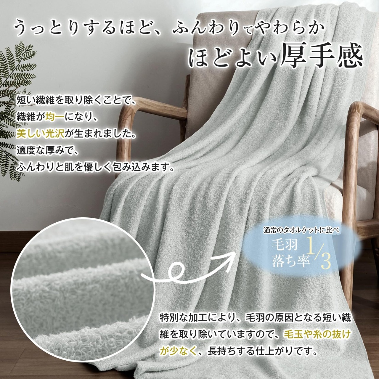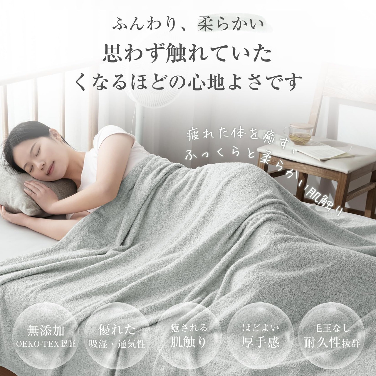 【一年中使えるほどよい厚手感】適度な厚さでふんわりと肌を包み込みます。適度な弾力とボリューム感を兼ね備えており、シーツとして敷いても、かけ布団としてもお使いいただけます。素肌で心地よさを実感できる寝具として、オールシーズンおすすめです。【様々なシーンに活躍】日常生活のさまざまなシーンで活躍するタオルケット。用途や家族の人数に合わせて、色違いで揃えるのもおすすめです。
