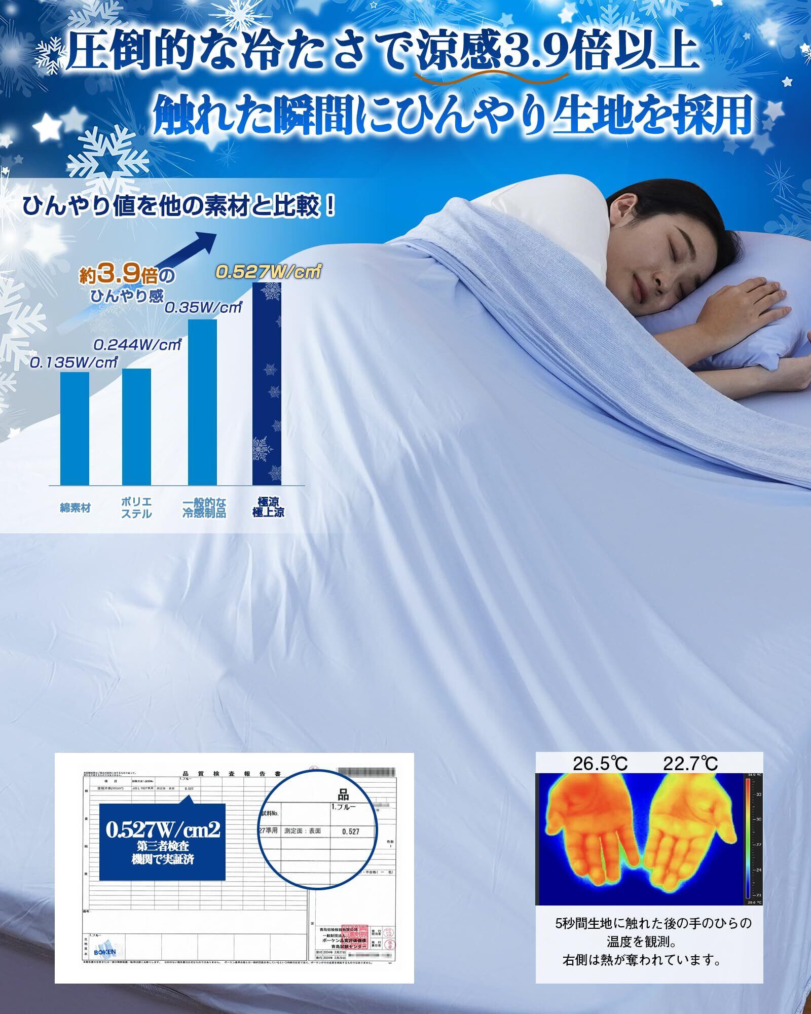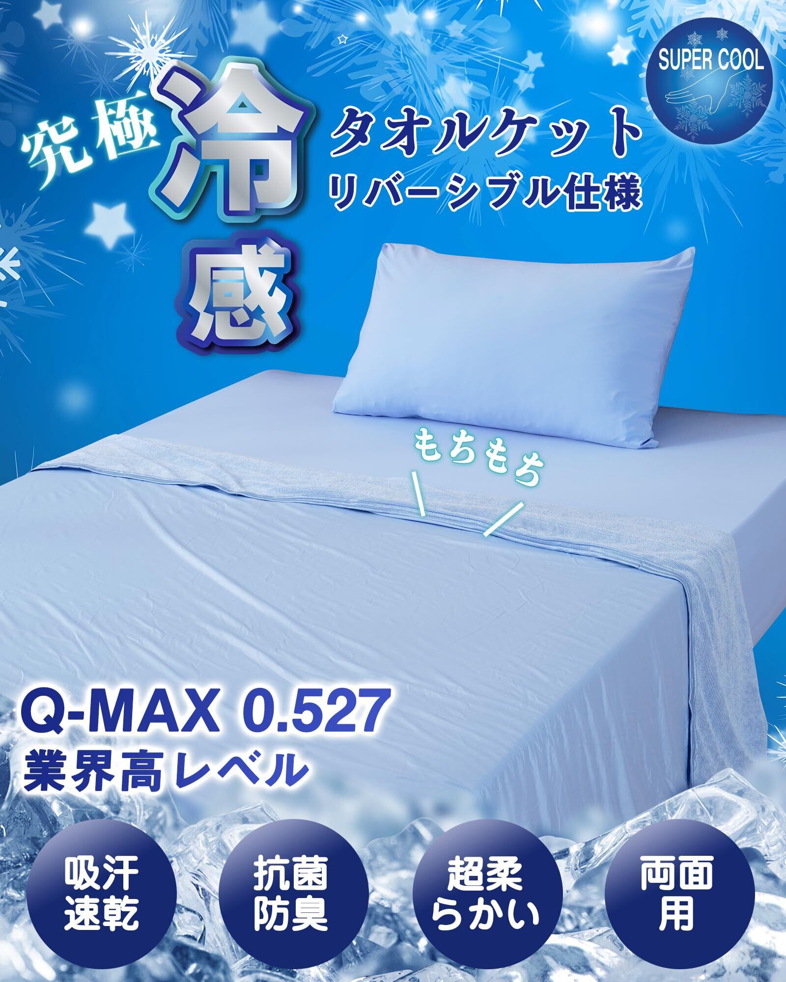 【究極の冷感 タオルケット!業界トップクラスQ-MAX 0.527】「暑い夜も快適な眠りを手に入れたい!」との思いから、何度も研究開発を重ね、革新的な鉱石冷感ナイロンとポリウレタンを融合させ、業界トップクラスを誇る本物のQ-MAX値0.527を実現した「究極冷感」寝具シリーズの接触冷感 タオルケットが誕生しました!従来の冷感素材に比べ、究極冷感生地には超高熱伝導性と優れた吸放湿機能が備わっています。業界高レベルの接触冷感値Qmax 0.527を実現し(綿素材の3.9倍)、触れた瞬間にひんやりと感じるため、暑い夏の夜にも快適な睡眠を提供します。一晩中持続して究極のヒンヤリ感を維持しつつ、ムレなどの不快感を極力抑制したサラサラな寝心地を実現しています!特に暑がりな方や、可能な限り冷房の使用を控えたい方に適合です。