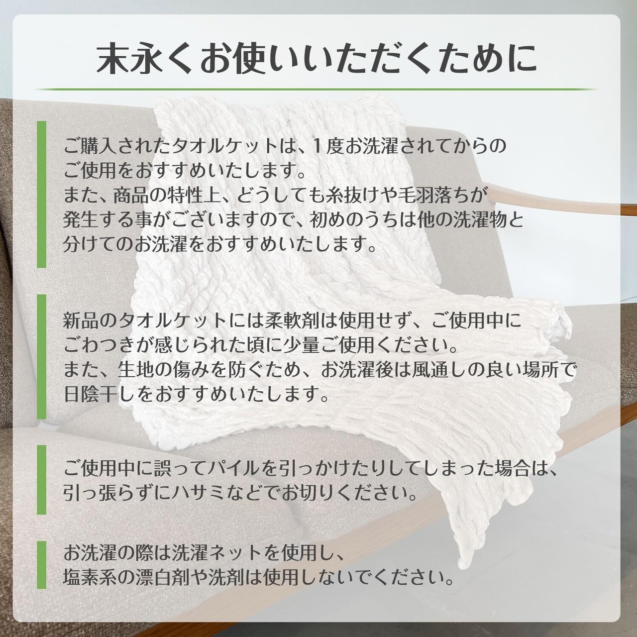 デザイン性と汎用性:シンプルながらも「くしゅくしゅ」とした表情が魅力のタオルケット。くすみカラーがお部屋に馴染みやすく、シングルサイズで使い勝手も抜群です。夏場のエアコン対策や、ちょっとひんやりしたい時にも最適です。