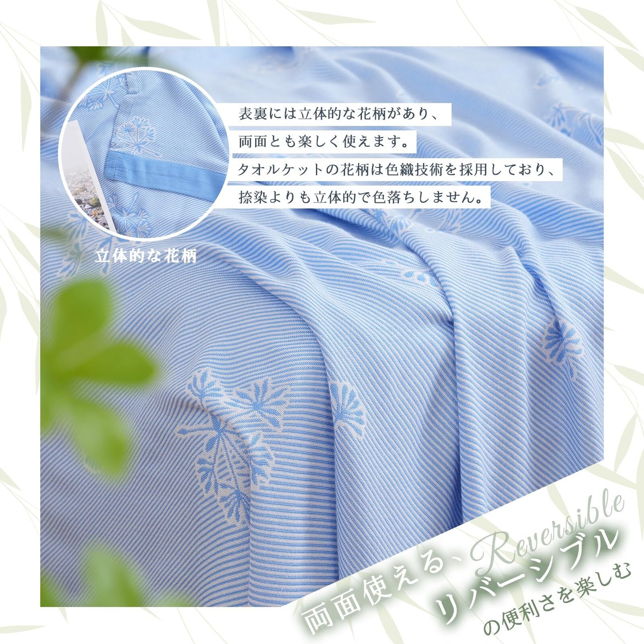【さらさら感たっぷり、心地よい眠り】さらさらで肌触りが柔らかい、春夏も快適に眠れる特長を持つタオルケットです。摩擦が少なく、ほとんど静電気が発生しません。さらに、天然の抗菌力と消臭力を備えており、敏感肌の方や肌の弱い方にもおすすめです。