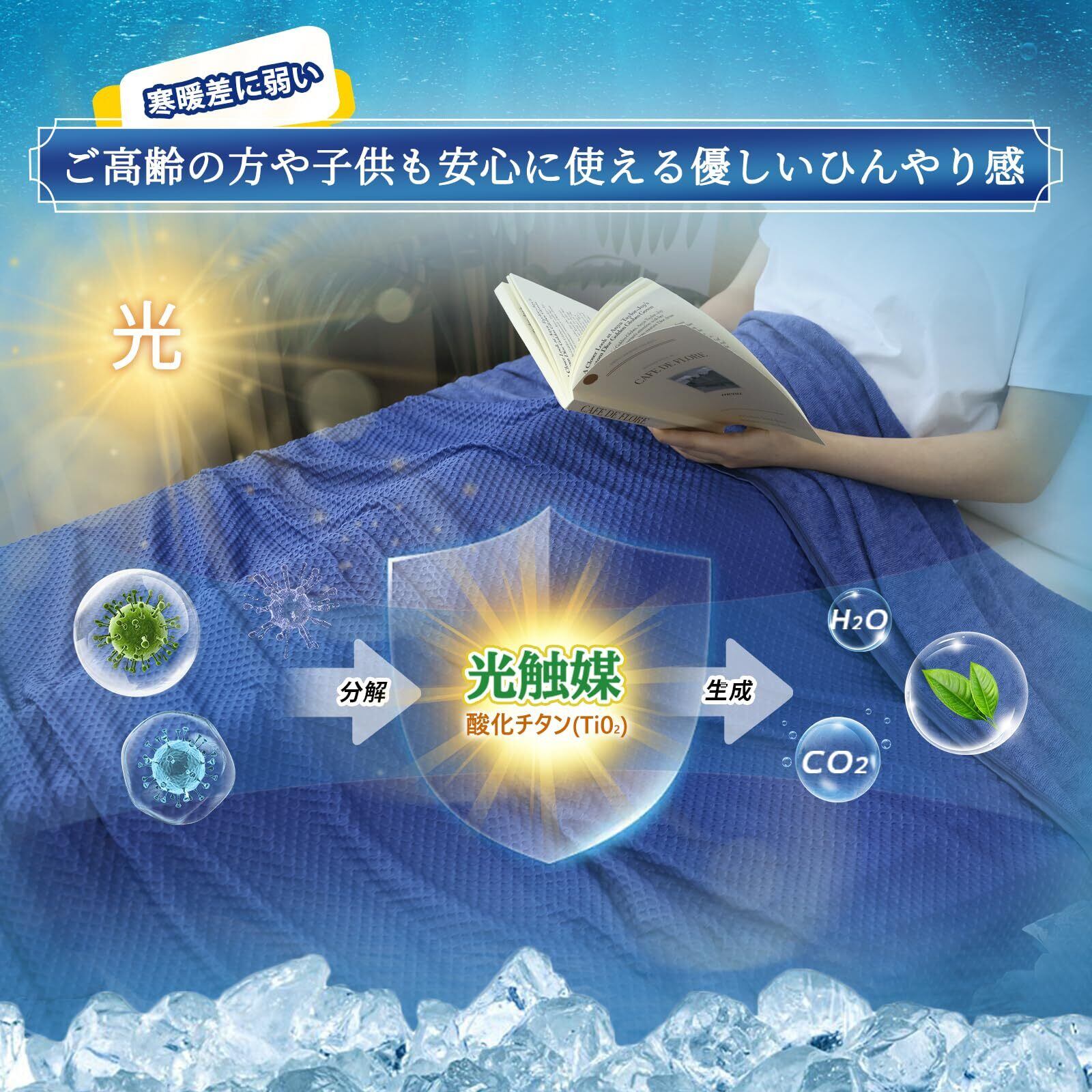 【光触媒抗菌加工】ブランケットは冷感面は光触媒抗菌加工が施されており、細菌やウイルスの繁殖を抑制。臭いのもとの菌の増殖を防ぎ、睡眠中の嫌な汗の臭いも消臭して、毎日清潔。